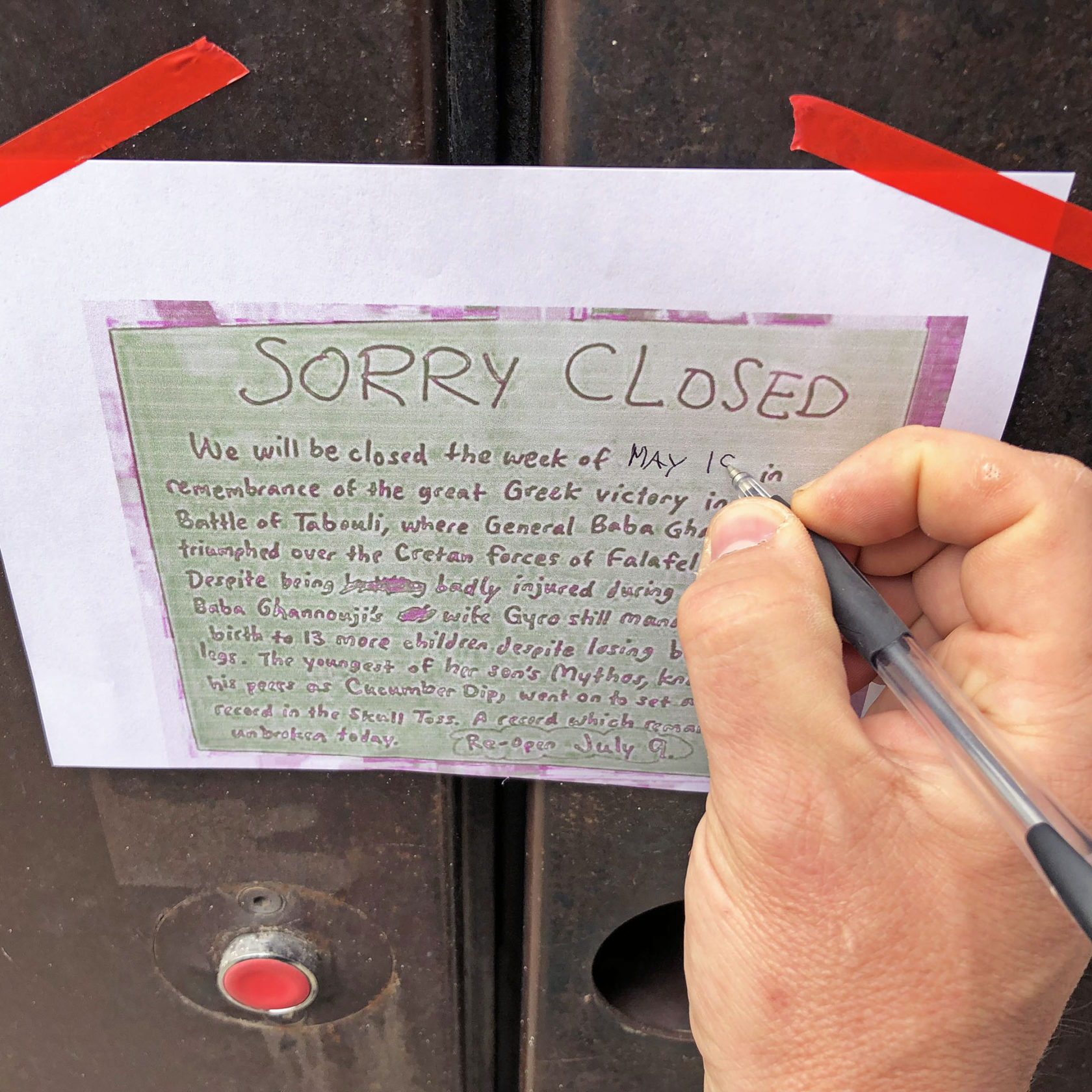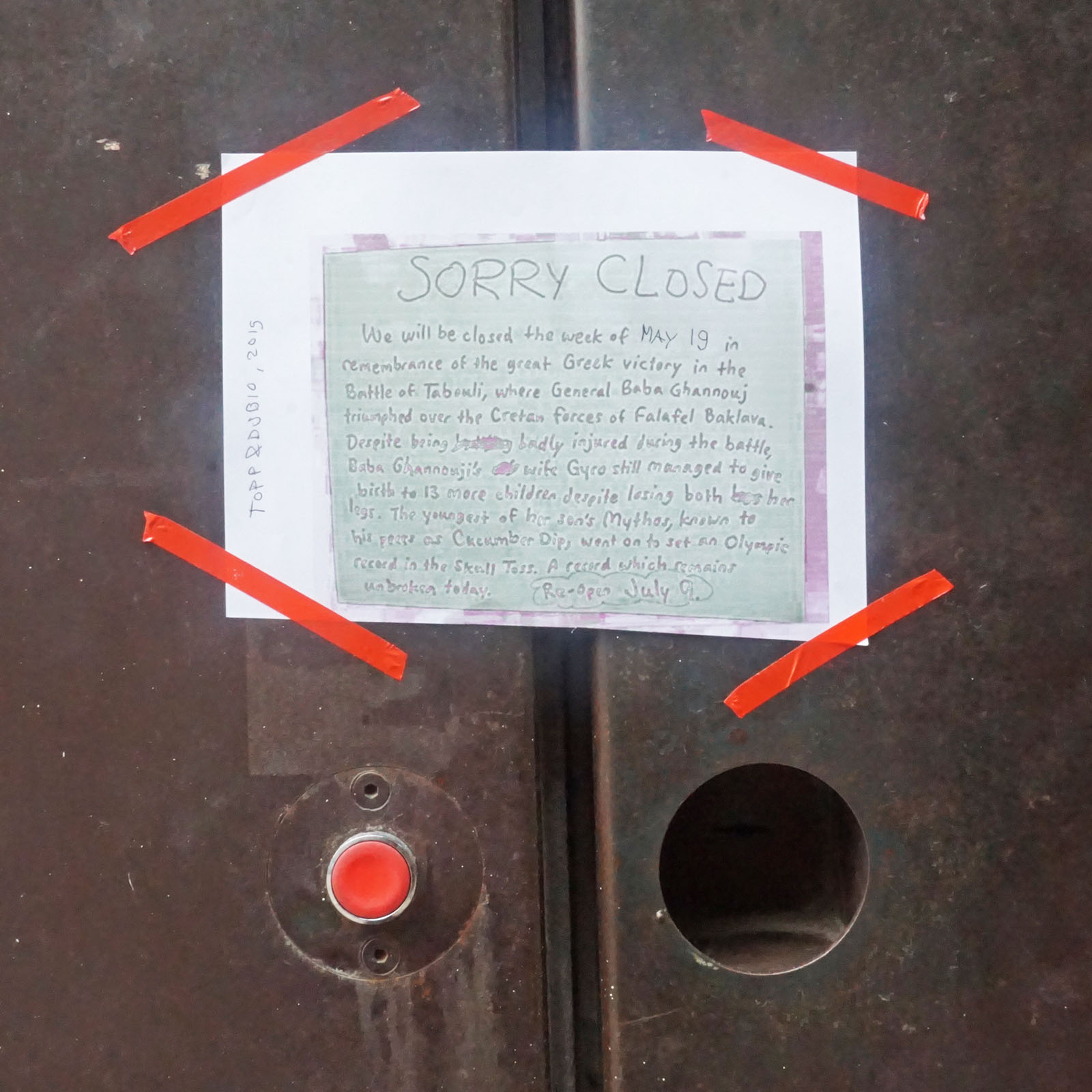 Tien jaar geleden vonden we de tekst als afbeelding op internet. We denken dat het een briefje op het raam van een Grieks restaurant zal zijn geweest, een excuusbriefje dat op vrijzinnige en poëtische wijze uitlegt waarom ‘de zaak’ van 4 juli (Independence Day in de Verenigde Staten) tot 9 juli gesloten is. Onafhankelijkheidsdag is iets om te vieren tijdens een independent art fair. Dus het leek ons ook mogelijk dat het hier om een Grieks-Amerikaans artist-run restaurant zou kunnen gaan, dat jaarlijks naar Griekenland afreist om zich te laven aan cultuur, geschiedenis, eten en nieuwe energie.