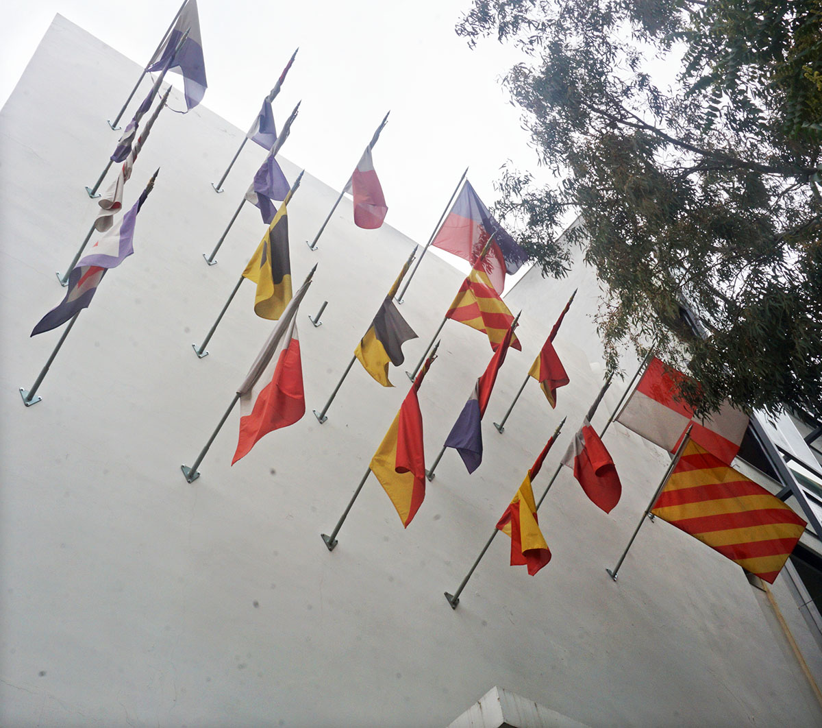 Ook deze rode deurbel blijft onbeantwoord. Naast de deur hangt een affiche met een legenda van maritieme vlagsignalen. En boven de deuren hangen de vlaggen als installatie. We nemen uitgebreid de tijd om het kunstwerk van het kunstenaarscollectief Arbid City te ontcijferen. Het is duidelijk dat hier gereageerd wordt op de wijk: ATHENS YOU FILTHY WHORE. Ter afsluiting van het bezoek verzegelen we de stalen deuren met ons pamflet. onze rode tape komt overeen met de hoeken van het affiche.