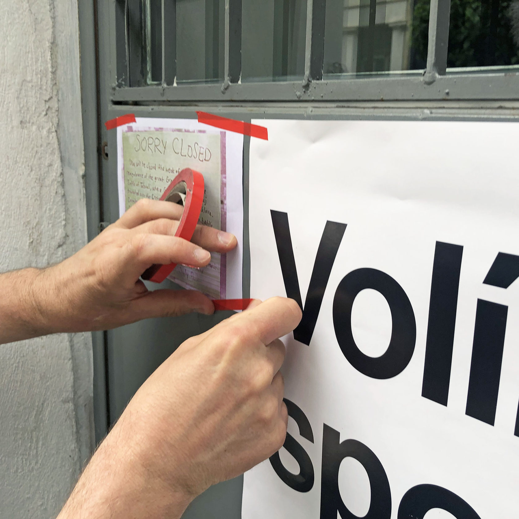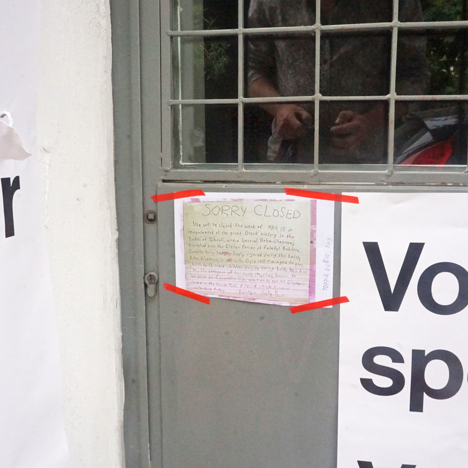 We besluiten van de nood een deugd te maken. Er zijn ontzettend veel kunstinitiatieven in Athene, maar er is door gebrek aan financieringsmogelijkheden tegelijkertijd heel weinig te zien. We zullen vaker voor een dichte deur komen te staan. Sorry Closed krijgt hiermee een nieuwe betekenislaag. Teruggekomen in ons appartement, besluiten we om op deze situatie voorbereid te zijn. Met het laatste restje inkt in de printer, produceren we een reeks Sorry Closed pamfletten waarbij we handmatig de datum kunnen invullen. Dankzij de inktschaarste zijn alle afdrukken uniek.