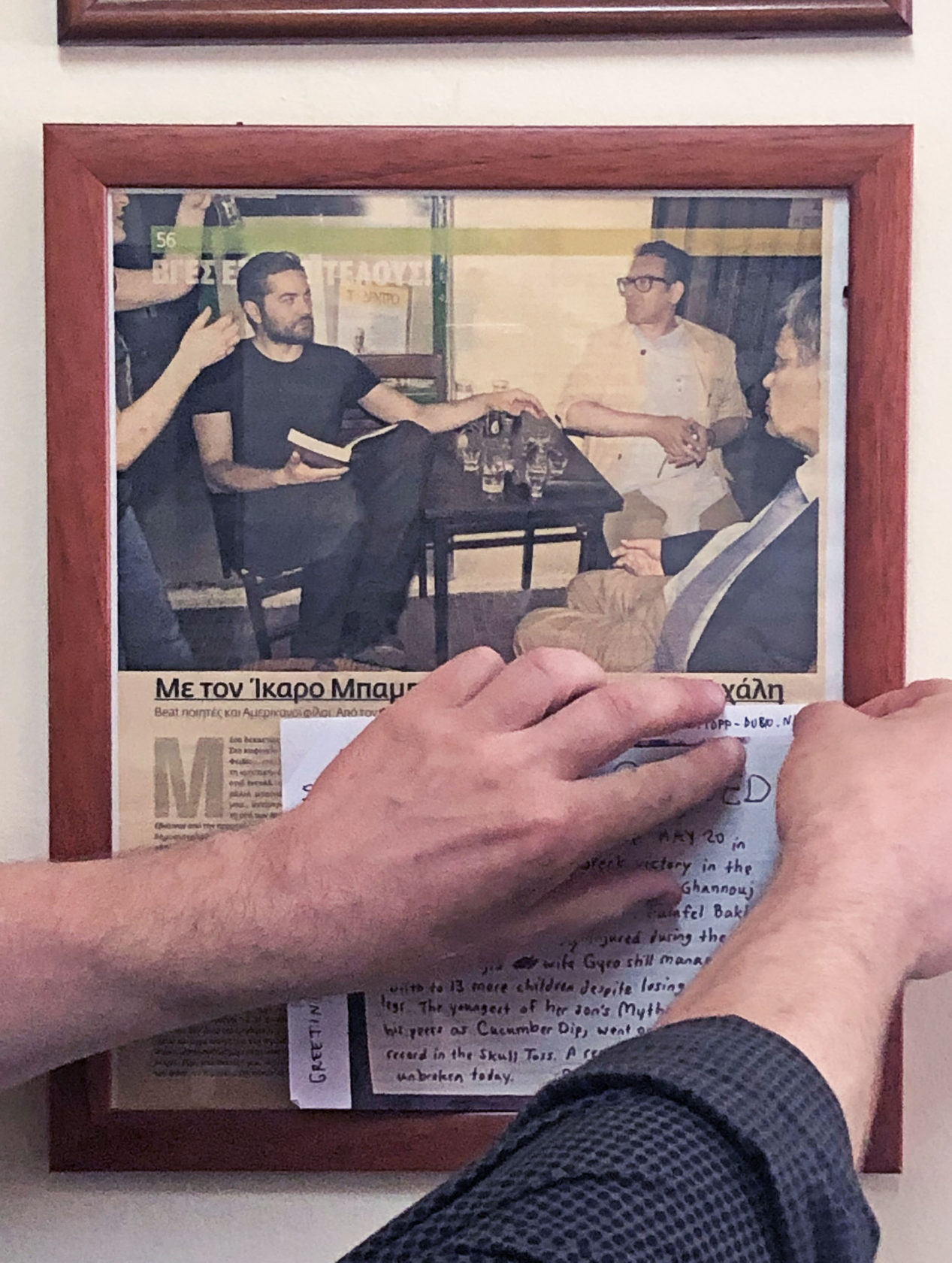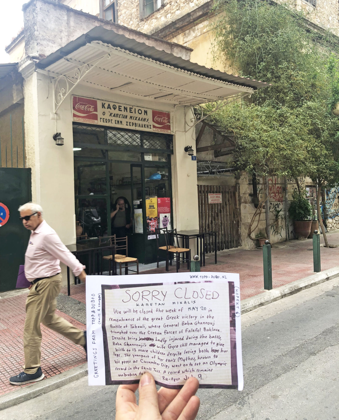 De eindbestemming van onze roadtrip door Athene is Kapetan Michalis. Het staat niet op de kaart en is formeel geen kunstenaarsinitiatief. Maar het café wordt elke woensdagavond bezet door kunstenaars en schrijvers. Dat weten we omdat deze historische plek het onderwerp is van het kunstenaarsinitiatief Corect, onze buren op Platforms Project. We hebben uitgebreid met hen gesproken over dit café en over het bestuderen van een ruimte als biotoop. Ook omdat wij een vergelijkbaar Topp & Dubio project hebben uitgevoerd in het Indonesische restaurant De Poentjak in Den Haag, vele jaren terug. Een plek die ons niet meer loslaat.