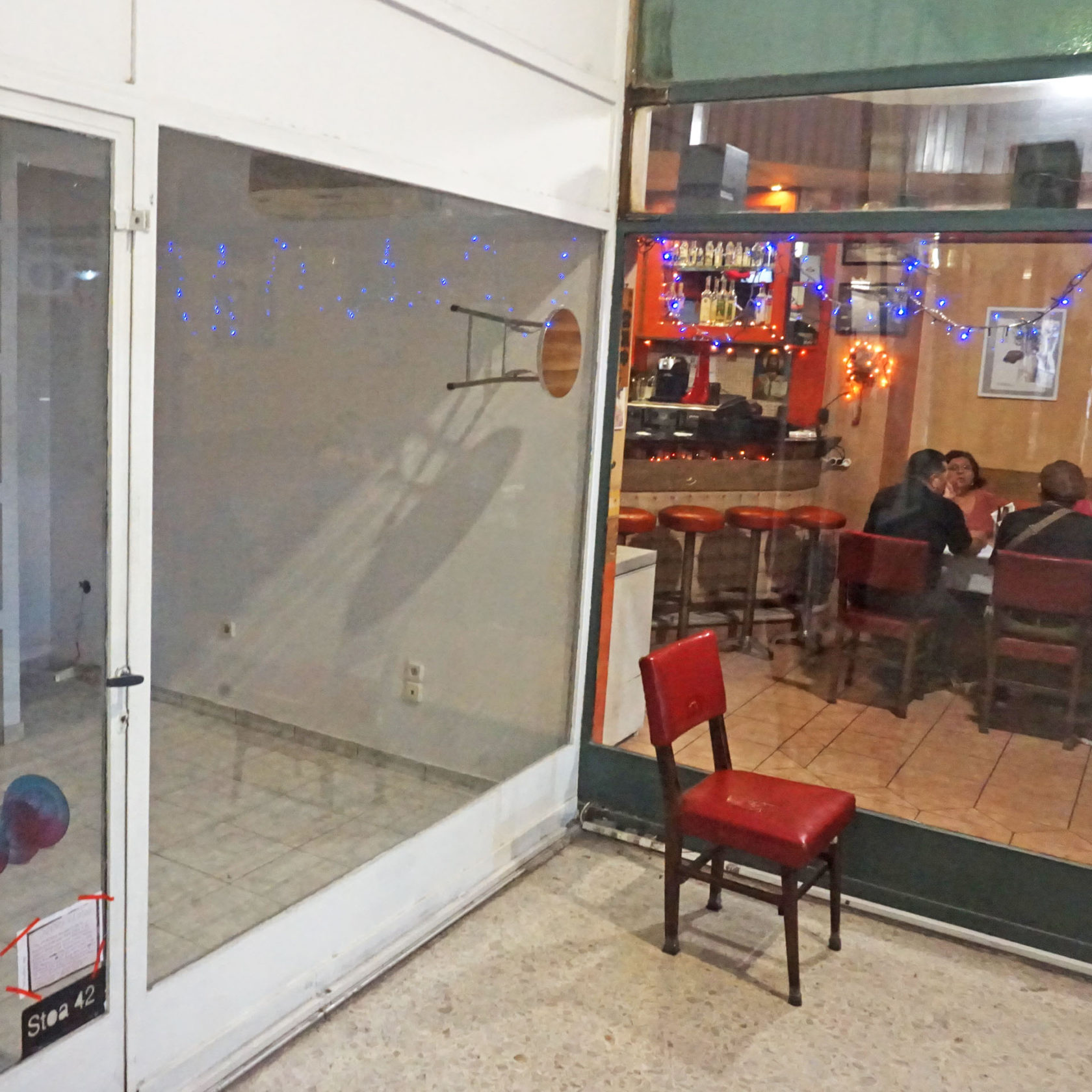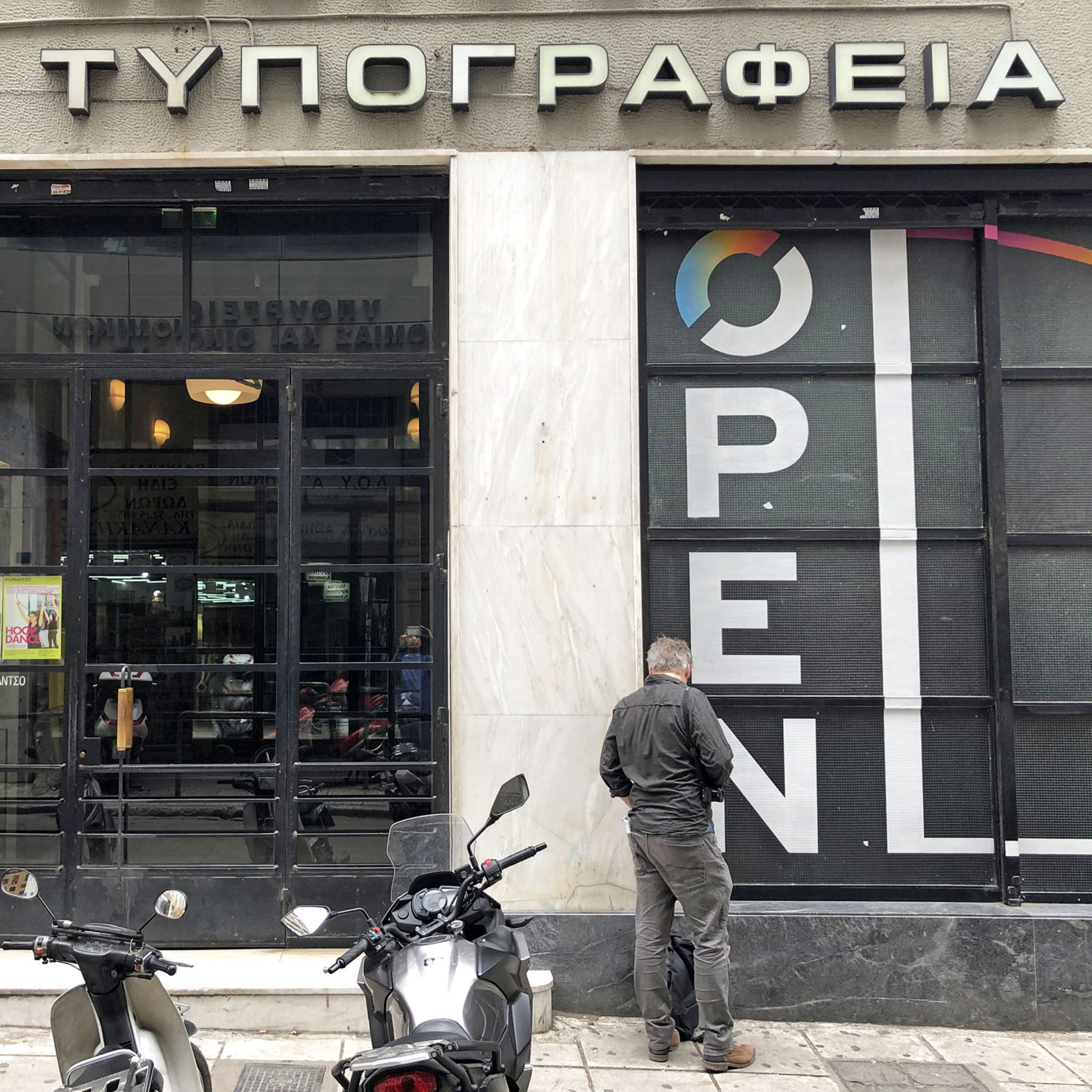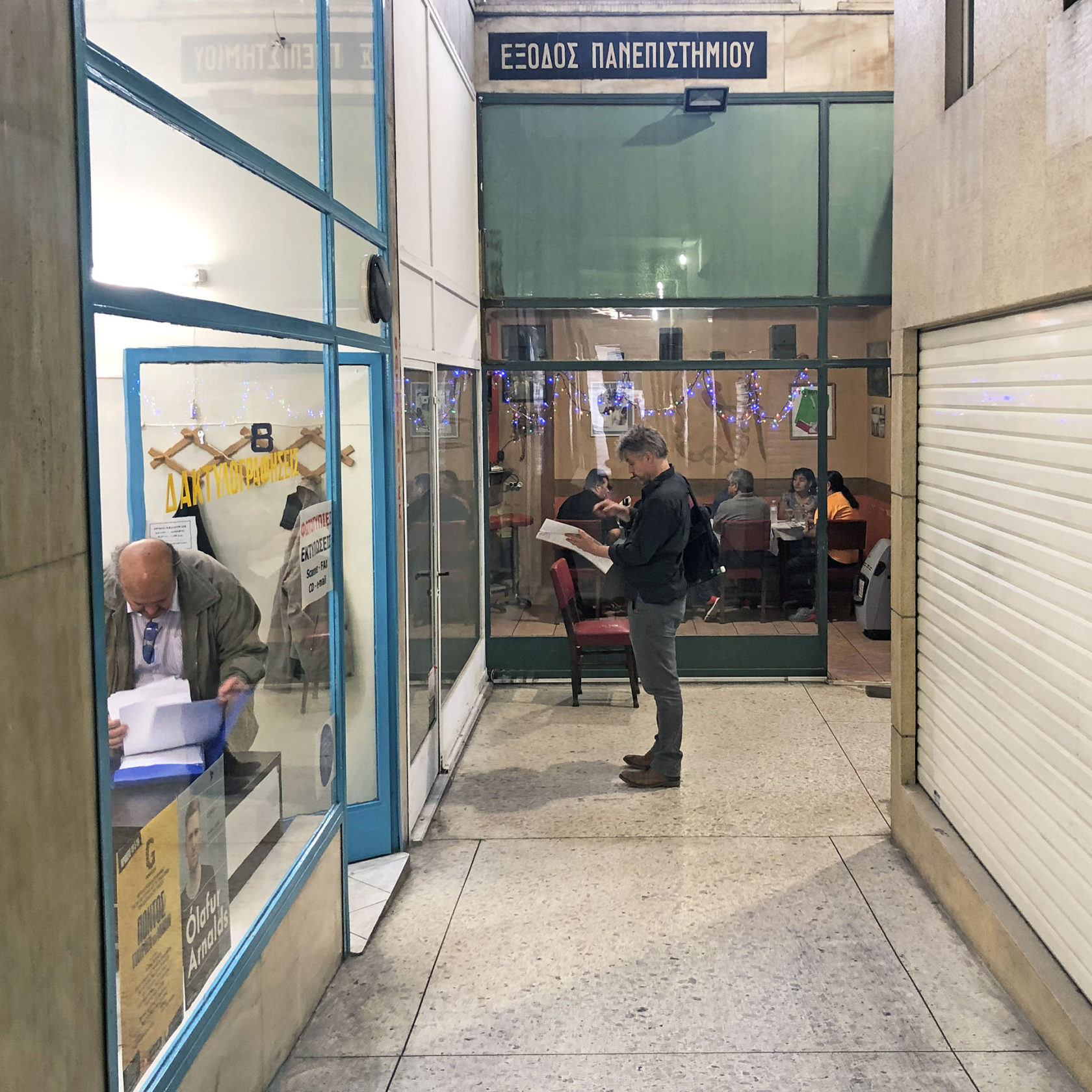 Het is ook lang zoeken naar Stoa 42 aan de centrale straat Panepistimiou. Ook hier is sprake van verschillende inpandige winkelgalerijen met veelal lege winkeltjes waarvoor geen moeite meer wordt gedaan om er een huurder voor te vinden. Maar na enkele rondjes om het blok staan we uiteindelijk bij een lege witte ruimte in een hoek van de galerij.