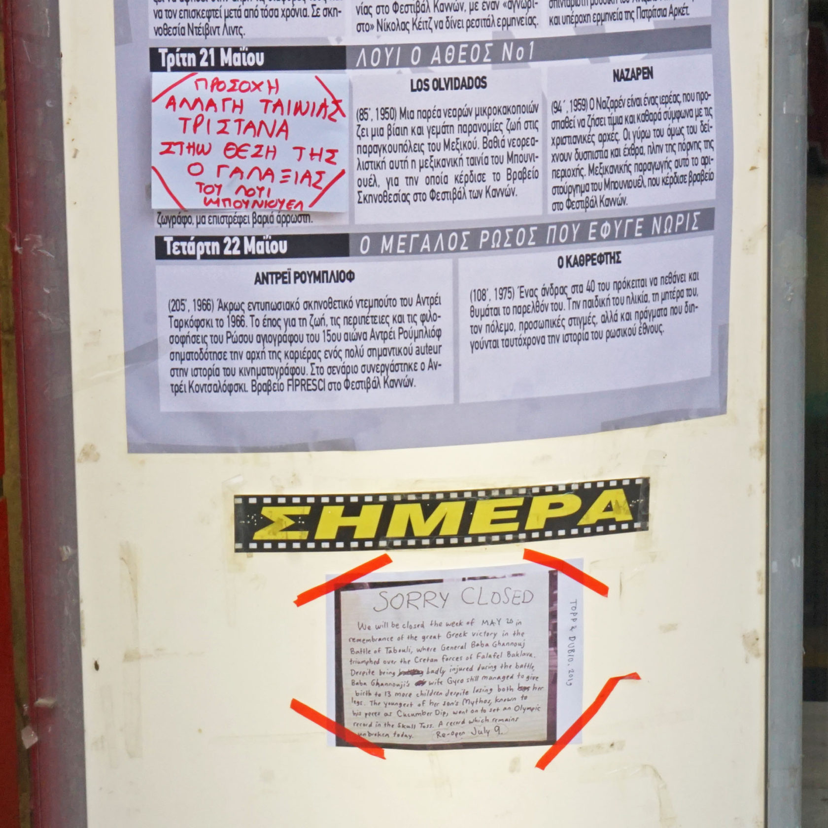 Bovengekomen besluiten we bij de entree ook hier een Sorry Closed pamflet aan te brengen. Hoewel we de art house bioscoop hebben kunnen bezoeken, is het tenslotte formeel nog gesloten. Nadat we ons pamflet met rode tape op de programmazuil hebben bevestigd, zien we dat het correctiebriefje van de film op 21 mei met precies dezelfde schuine rode markering is aangebracht.
