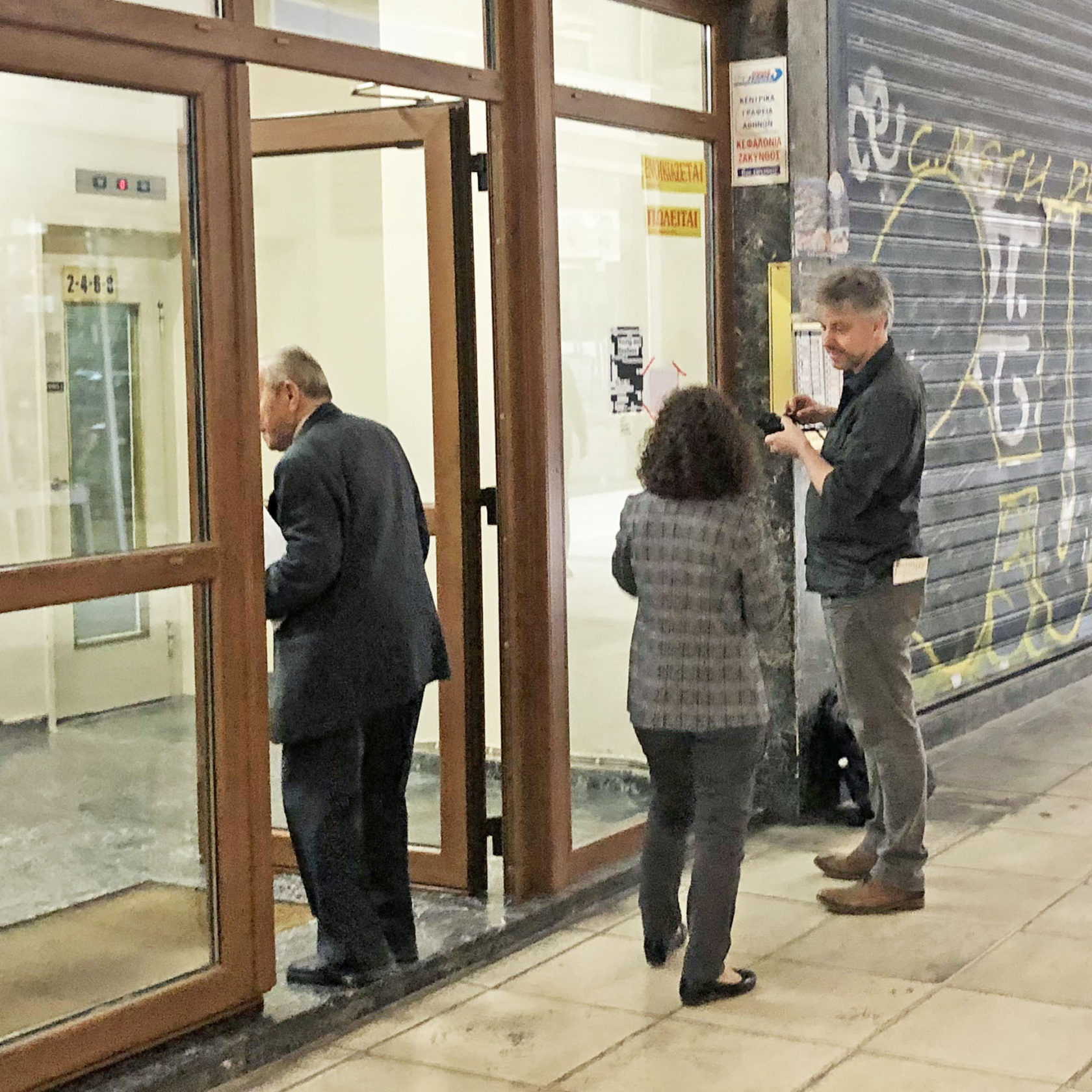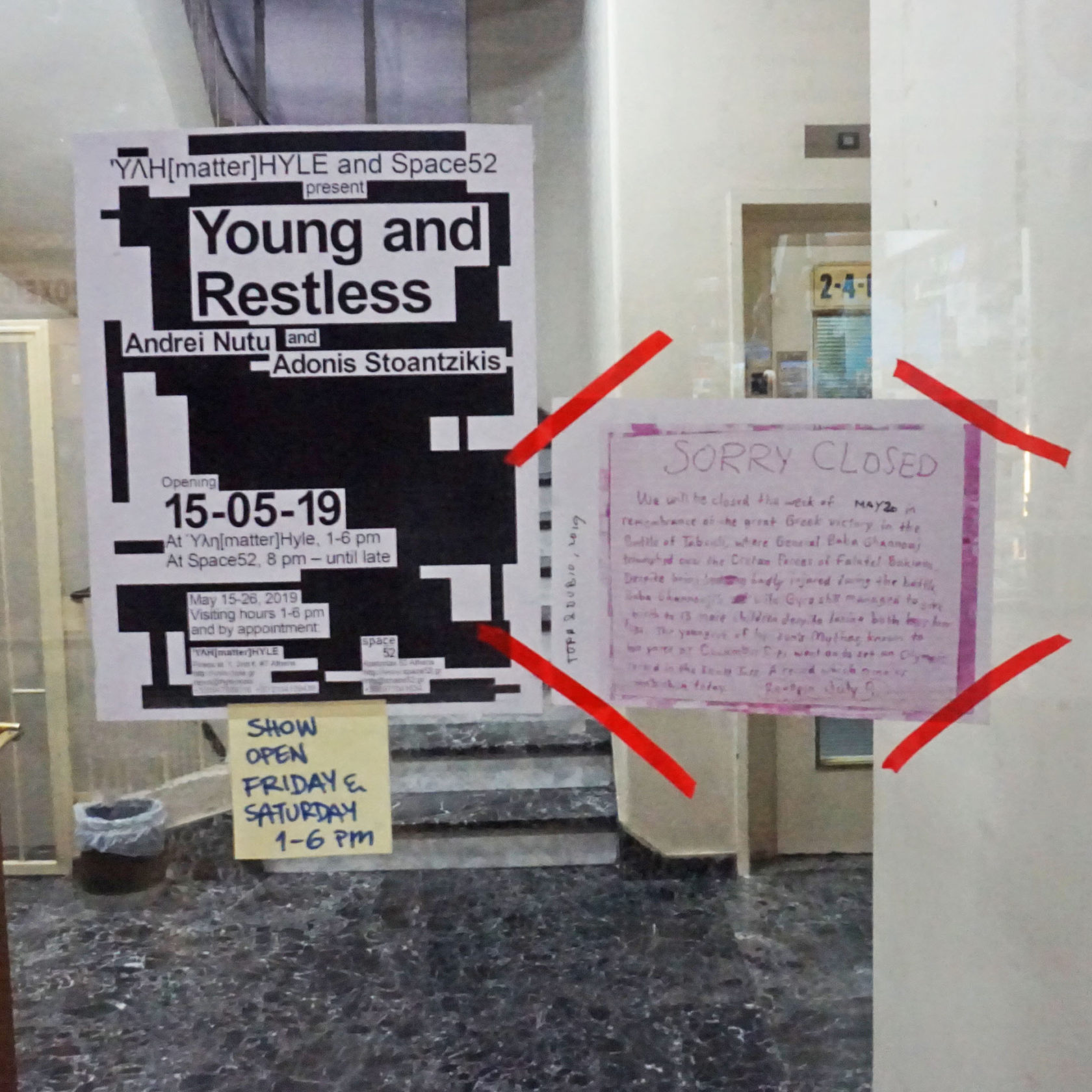 In de buurt van het Omoniaplein gaan we op zoek naar Ύλη[matter]HYLE, een semipublieke, semipersoonlijke ruimte in het centrum van de stad. Dat belooft alvast niet veel goeds. Het adres is eenvoudig: Piraeous 1. We zien er een dichte entree met rolluiken en plakken ons pamflet op een deur met rolluik. Na het invullen van de datum en het aanbrengen van onze signatuur is het tijd voor de fotografische registratie. Maar we hebben ons nog niet omgedraaid of de deur gaat open. Een vrouw kijkt ons vragend aan met een blik die past bij de graffiti ‘Voodoo Death’ op het aangrenzende rolluik. Ze legt uit dat dit een verlaten hotel is en geen ruimte voor kunst, politiek en wetenschap zoals wij het graag zouden zien. Bovendien geldt het adres Piraeous 1 voor het gehele bouwblok, dus het kan ook ergens anders zijn. We zoeken verder. Ze heeft niet door dat het Sorry Closed pamflet al op de deur hangt, dus dat laten we maar zo. Een verlaten hotel mag zich ook best eens verontschuldigen.