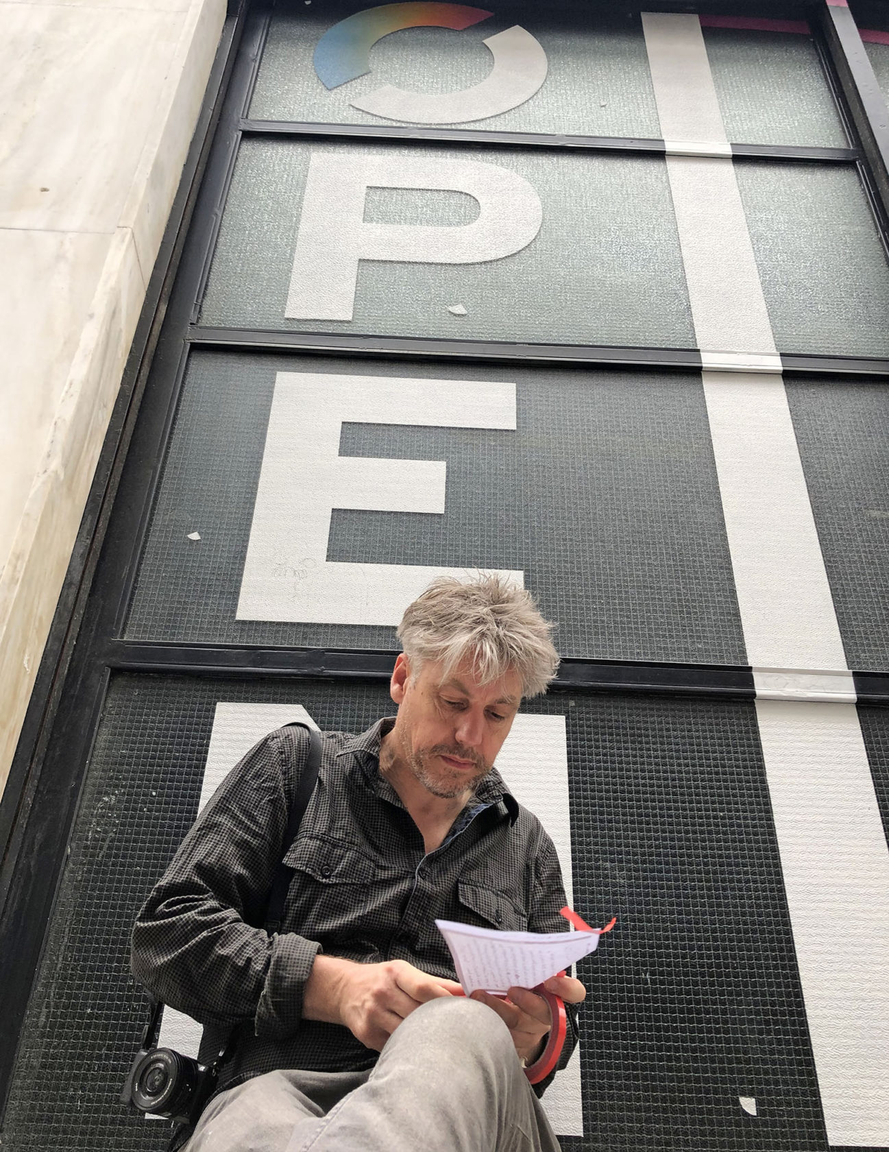 Dan maar naar OMMU Publications. Een publicatie of uitgeverij kunnen we ook als een artist-run space opvatten. Bovendien is er een boekwinkel bij. Wellicht heeft het reguliere openingstijden. Op het gebouw lezen we de woorden ‘TYPOGRAFIE’ (horizontaal) en ‘OPEN’ (verticaal). We gaan naar binnen en nemen de grote benedenruimte in ons op. Er liggen enkele publicaties op tafeltjes, maar de lange bar met enkele gasten vertelt ons dat we in een grand café staan. We vragen het aan de barkeepster die ons doorverwijst naar de jongere barkeepster, die wel Engels spreekt. Ja, OMMU bevindt zich op de tweede verdieping maar het is alleen op afspraak open. Teleurgesteld en opgetogen staan we enkele ogenblikken later weer buiten. Tijd voor actie. We plaatsen Sorry Closed bij het woord OPEN.