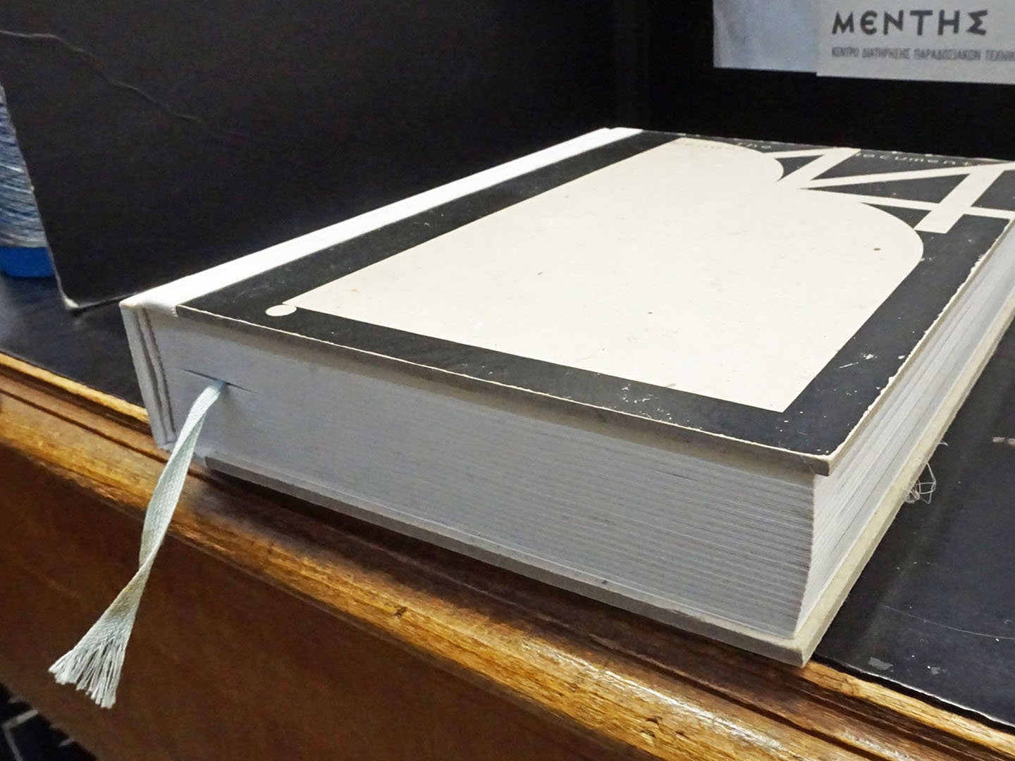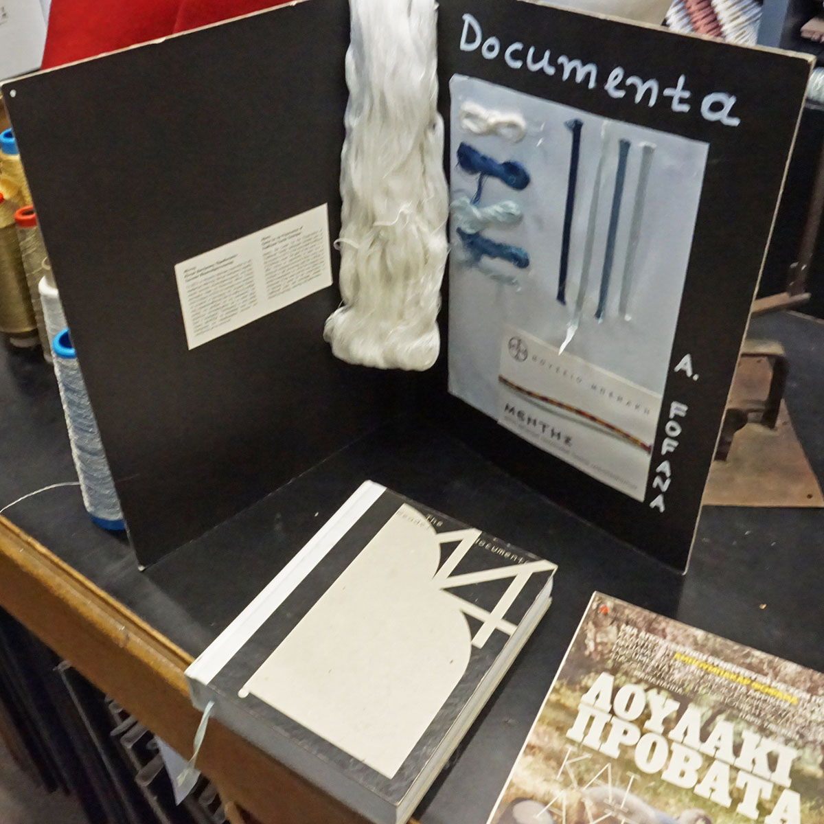 Uiteindelijk komen we bij een interessante display terecht waarop Documenta staat geschreven. De catalogus van Documenta 14 ligt erbij. Dit is dus tevens de plek waar het boekenlintje van de catalogus is vervaardigd! En zo krijgt het bezoek toch een hedendaagse tintje. De beheerder legt uit dat het een enorme klus was. De machines hebben drie maanden lang, 24 uur per dag non-stop gedraaid om de lintjes op tijd af te krijgen. En ze hebben het gehouden!