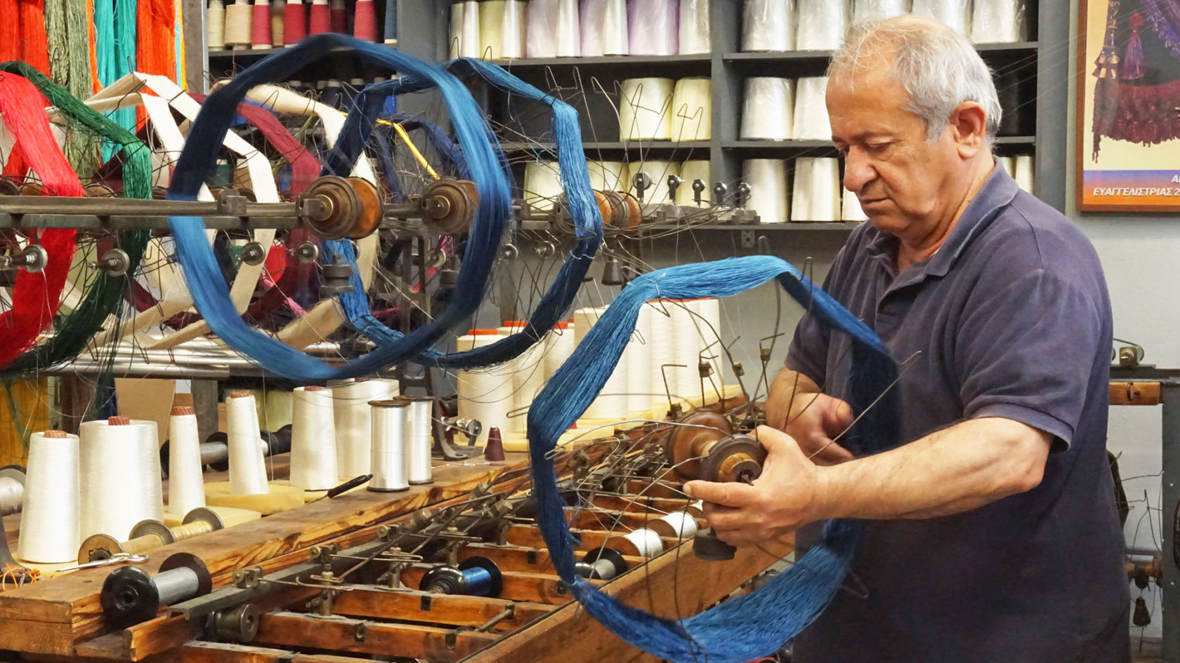 Hoewel we onze bezoeken aan musea buiten beschouwing laten, moeten we een uitzondering maken voor het Benaki Museum. Dit museum voor Griekse cultuur beschikt over 6 locaties en wij bezoeken de kleinste. Het is de textielwerkplaats Mentis, een donatie van de gelijknamige industriefamilie die heeft bedongen dat de weverij in werking blijft. En inderdaad, het is gesloten. De vitrine aan de monochrome donkergrijze gevelwand is leeg en er is geen bel bij de deur. Maar wanneer we op de deur bonken, wordt er na enige tijd toch opengedaan. We zijn welkom en spreken met de beheerder. Een gepensioneerde oud-medewerker van de Mentis fabriek houdt de machines draaiende. We krijgen interessante demonstraties te zien van machines die verschillende soorten sierlinten kunnen draaien. De mechanieken die de patronen bepalen zijn fantastisch.