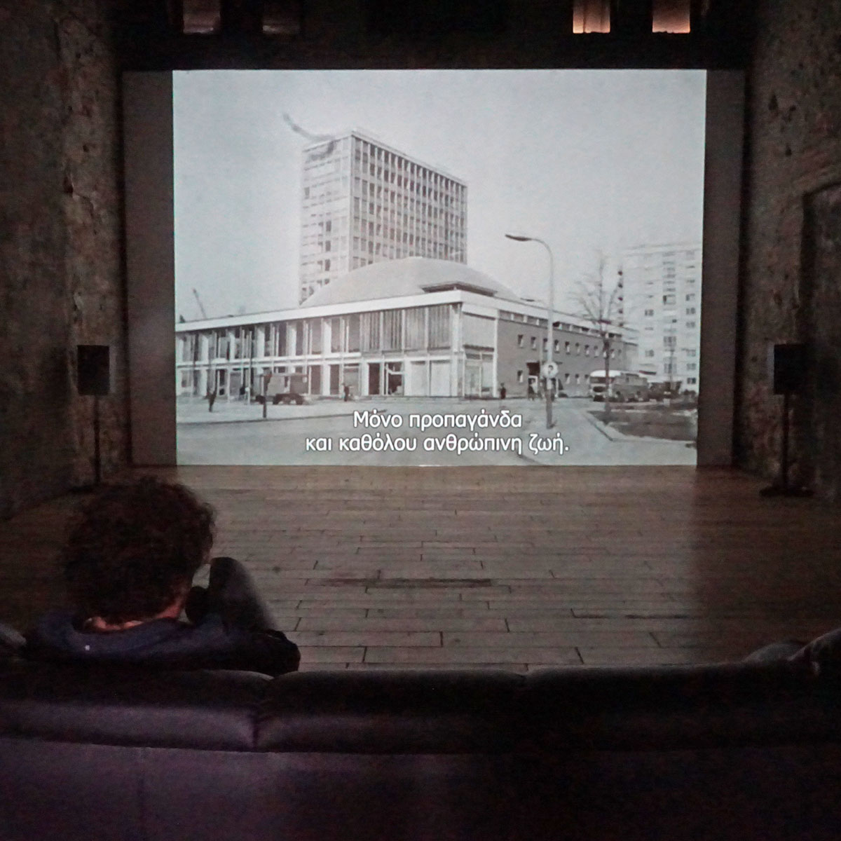 De achterruimte is een grote filmzaal waar een 40 minuten durende documentairefilm Arbeit van Duncan Campbell over de Duitse econoom en technocraat Hans Tietmeyer is te zien. In het midden staat een leren bank die zo lekker zit dat we de film helemaal afkijken.