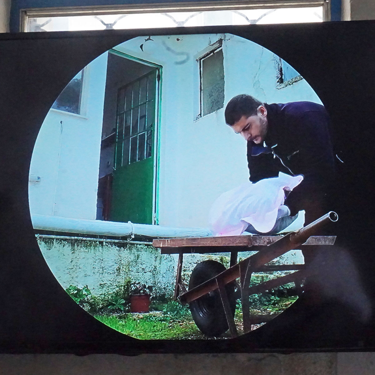 We maken even een uitstapje naar Piraeus, de havenstad ten zuiden van Athene. Hier bevindt zich RODEO. En er is zowaar een tentoonstelling. De galerie heeft ook een vestiging in Londen en de galerie manager Aristogenis Kyrtsis die nu aanwezig is, kwam vorig jaar naar Athene vanuit Italië. RODEO is gelegen in een oud pakhuis in het industrieel wijkje achter het station van Piraeus. Een gebied in opkomst volgens de galerie manager. Hiernaast zit een wijnbar en een stuk verderop is Pirée, de trendy barokke nachtclub waar later ook het afsluitingsfeest van Platforms Project zal plaatsvinden. De galerie bestaat uit twee gelijke ruimtes die zijn gescheiden door het kantoorgedeelte, de enige architectonische ingreep in het pand. In de voorste ruimte staan sculpturen en er zijn op schermen video’s te zien. We worden vooral getroffen door een video van Menelaos Karamaghiolis waarin een grafdelver een kussen naar haar laatste rustplek brengt alsof het een hond is.