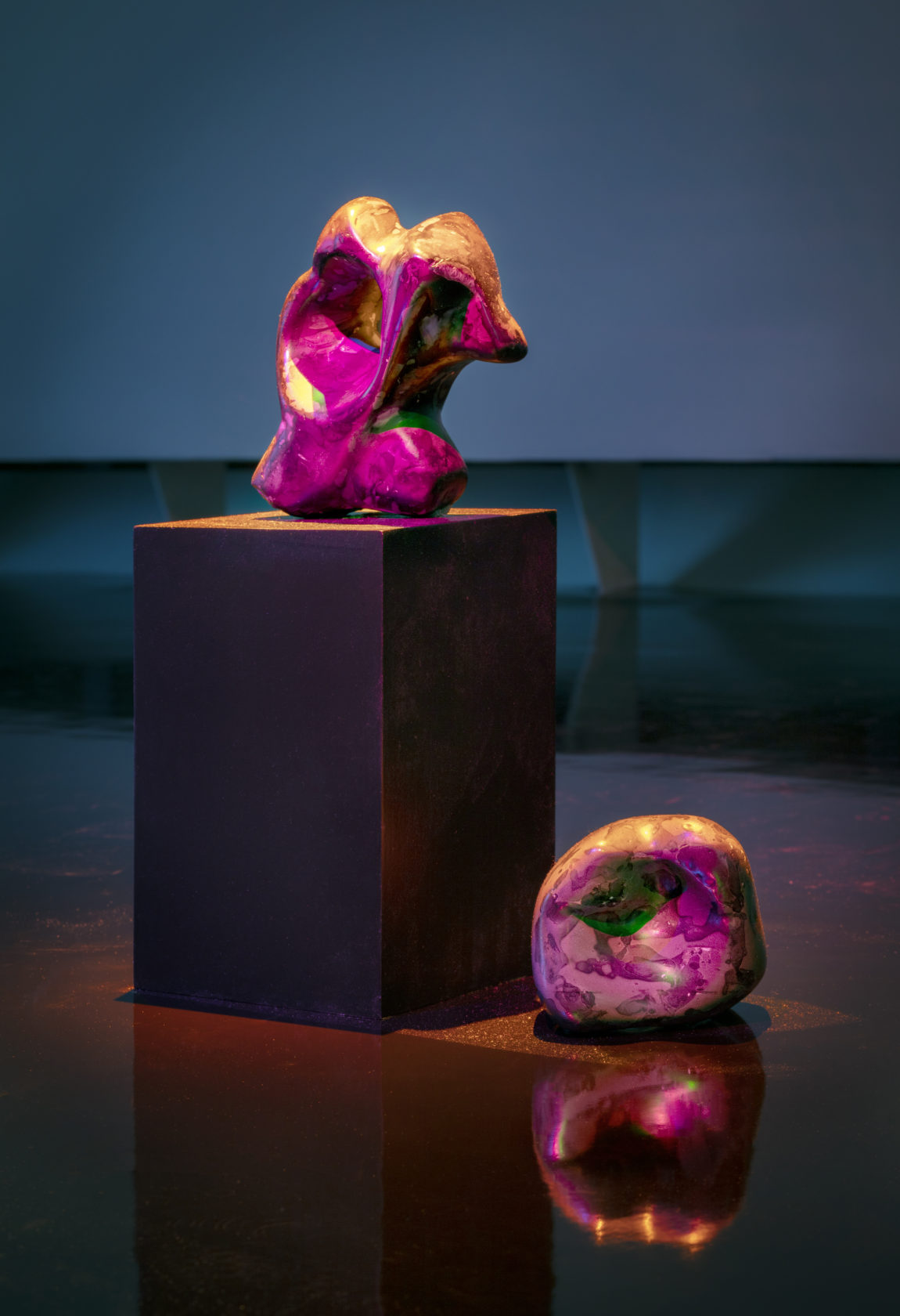 I had previously worked with Helen for a group exhibition at Garage Rotterdam. I was looking for an artist with whom I could imagine this exhibition becoming a spherical whole. Helen crossed my mind quite soon. She had taken her work into a new direction that I found even more interesting. We started thinking together. I said: I want to treat the space as a large area. She also liked that idea. We agreed that we had to do something with the floor. Our first thought was a carpet. Somehow, we couldn’t decide which colour or material to pick. Earlier on, I had shown Helen a picture of Sophie Jung’s exhibition in the Basel art museum, who had created a silver mirror floor. I thought that looked exciting. Weeks later Helen suddenly said: What do you think about a black mirror floor? Then everything fell into place. The floor is an integral part of the exhibition. Because it plays such an important visual role, it also made it easier for us to make decisions about other matters. That is when you can start fitting the pieces of the puzzle together.