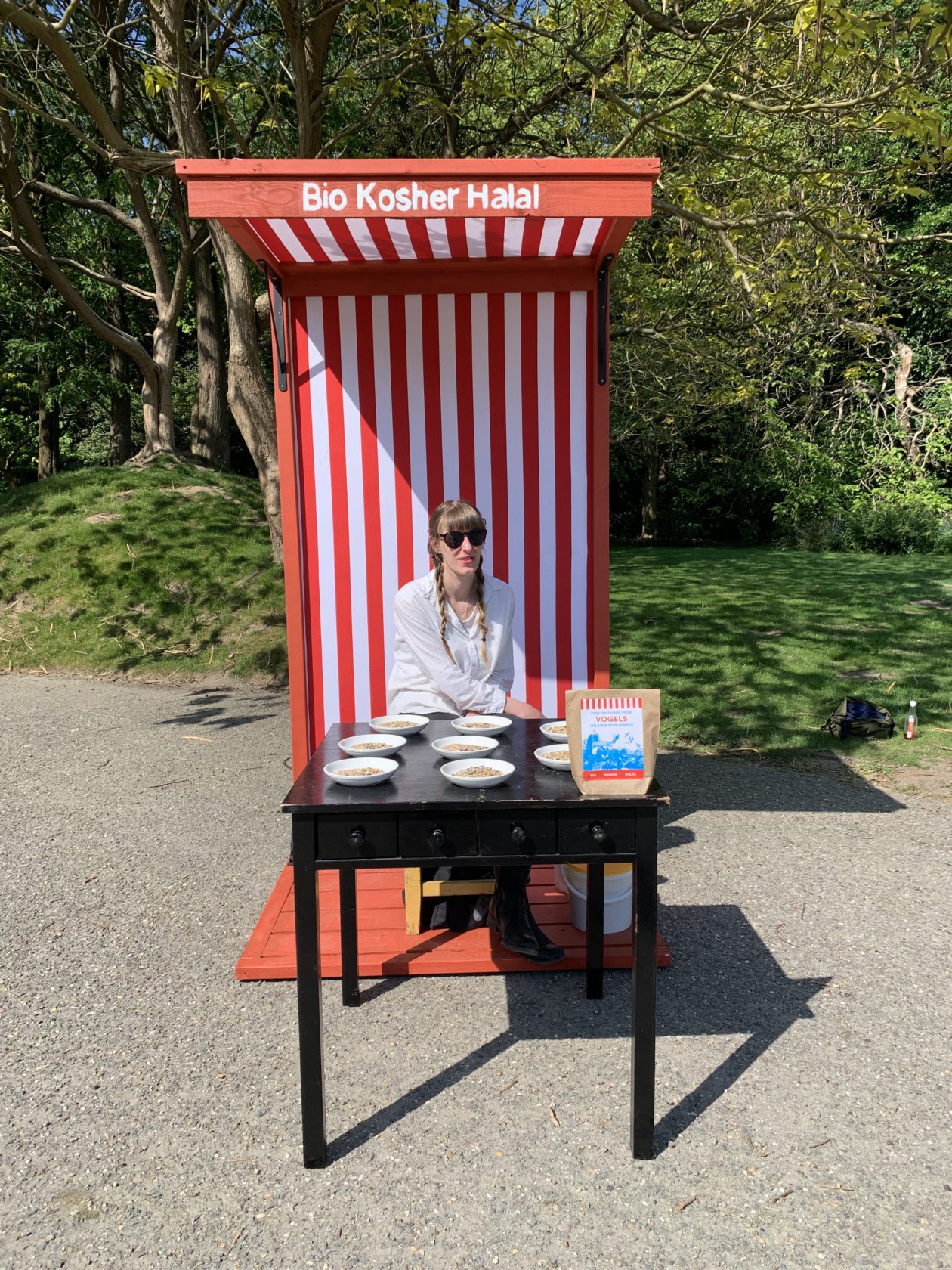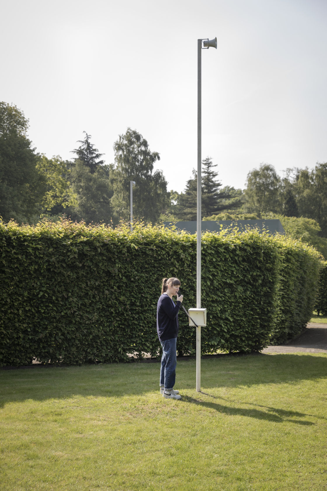 Naar mensen die contact maken, zwaait ze vanop haar eiland, terwijl ze voor toevallige passanten evengoed een bezoeker kan zijn. “Er lopen hier ook veel kinderen rond, wat in de meeste musea niet het geval is”, duidt Pacquée. “Ze kunnen hier op een leuke manier met kunst in aanraking komen. Daar hou ik rekening mee.” ‘Public Speaking Apps’ (2019) zijn palen met megafoons die de mogelijkheid bieden om met elkaar te spreken. De megafoons staan op kinderhoogte en die doen niets liever dan boodschappen naar elkaar schreeuwen. Bij volwassenen ligt het moeilijker. Zij geraken vaak niet verder dan schuchter hallo roepen. De palen staan nochtans verscholen in de hagenkamers van de Hortiflora, een plek waar zelden mensen passeren. Ook hier keert Pacquée de rol van de kunstenaar en de toeschouwer om. Het park als locatie en haar functies leveren haar ideeën om bepaalde werken te kiezen of te creëren. ’s Ochtends valt het haar op dat het park vol halsbandparkieten zit. Deze exotische vogels overleven door de milde winters. Dat zette haar aan om vogelzaad te verkopen. Daar botst ze op de regelgeving: in de publieke ruimte mag je geen vogels voederen. Het is geven en nemen in het park. Op een plaats in de zon zaait ze pompoenen en bonen die foto’s van haar reisobservaties mogen overwoekeren. De konijnen hadden de bonen al meteen opgegeten.