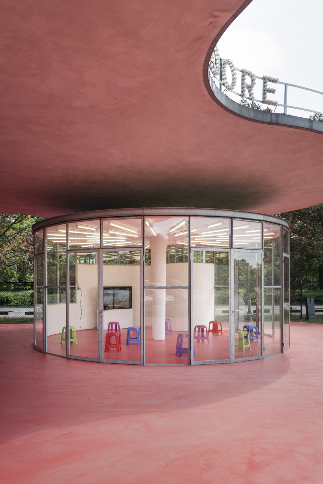 De rol van wandelaar en observator geeft Pacquée nu aan de bezoeker. Haar werk staat verspreid over het park. We wandelen langs vergeten of onbekende plaatsen omdat we uit gewoonte vaak dezelfde weg nemen. Daardoor merken we ook permanente beelden op die we uit het oog waren verloren. Ze maakt onbekende delen wakker of brengt vergeten zaken opnieuw onder de aandacht. Dat doet ons beseffen hoe selectief we kijken. Naarmate iets vertrouwder wordt, verslapt onze aandacht. Het eiland is een knap voorbeeld van een plaats die onopgemerkt aan ons voorbijging en die we vanaf juli zeker gaan bezoeken. ‘Artiesteningang’, een permanente sculptuur van John Körmeling in een uithoek van het park, is een werk waaraan we nog weinig aandacht schonken omdat het intussen een vertrouwd onderdeel van het park is. In het ronde paviljoen toont Pacquée haar videowerk ‘Running Around’ (2015). We zien haar cirkels lopen rond zaken die ze in Antwerpen aantreft: een artificieel heuveltje, een wegverzakking en een kiosk. Doorgaans hebben we er geen aandacht voor, maar doordat ze er nadrukkelijk rondloopt, krijgen deze dingen een andere betekenis. Zoals zij doorgaans observator van de publieke ruimte is, worden wij ons nu erg bewust van het park.