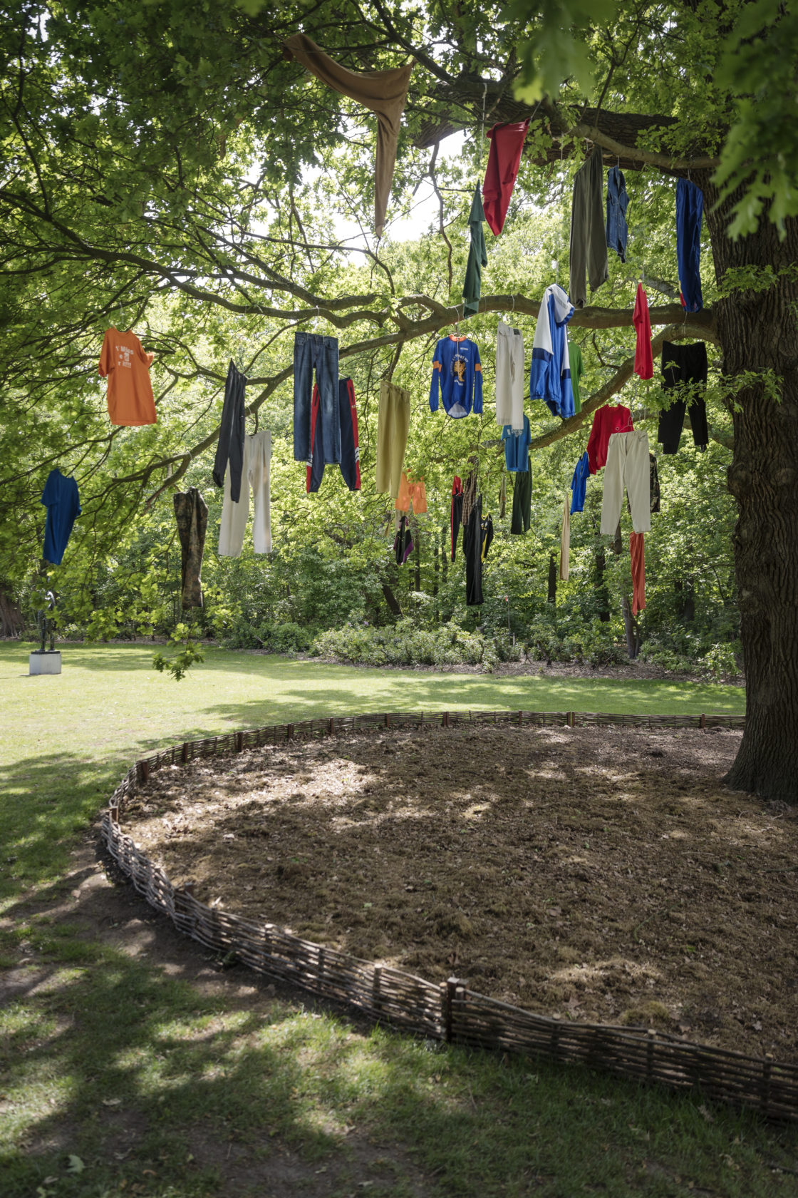 Hoe we ons gedragen en met elkaar omgaan is niet altijd fraai. ‘The wind will blow away the smell of the boyfriend who left for no reason’ (2019) bestaat uit mannenkleren die uitwaaien aan de tak van een boom. Op een gepaste manier communiceren is iets wat ook terugkeert in het werk met de megafoons. In ‘Delete, wipe out all at once. This content has been blocked for your protection’ (2019) zien we een constructie die ons herinnert aan verkiezingspanelen, maar in plaats van iets mee te delen, schildert ze de constructie deels zwart. De zin voor communicatie en samenwerking uit zich ook in het uitnodigen van andere kunstenaars. In het Braempaviljoen krijgen we een knappe selectie te zien van videowerk van Ana Mendieta (°1948-1985). Als pionier in de performancekunst in de natuur mocht zij hier niet ontbreken. Joëlle Tuerlinckx herneemt het werk ‘Le Tag (200m)’ (2017). Een museummedewerker kalkt deze 200 meter lange lijn door het park elke zondag om 17u opnieuw wit. In juli en augustus vindt er elke zondag een performance plaats. Naast Pacquée komen ook Suchan Kinoshita, Tsubasa Hori, Lilibeth Cuenca Rasmussen en Minja Gu aan bod. “Ik nodigde allemaal vrouwen uit, maar dat is eerder organisch gegroeid. De kunstenaars die een performance zullen uitvoeren, koos ik omwille van hun band met het Oosten en het Westen.”