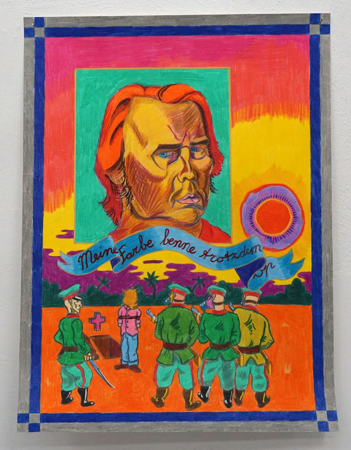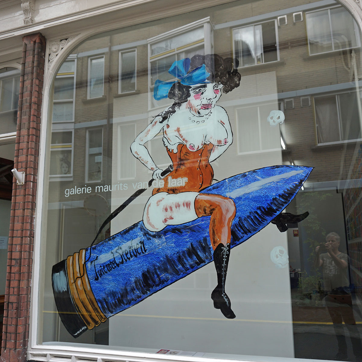 Het is oorlog. Het is altijd wel ergens oorlog, maar gelukkig niet overal tegelijk. Soms zijn er conflicten waarvan we het bestaan niet kennen, buiten het zicht van camera’s of journalisten. Bij Galerie Maurits van de Laar liggen de zandzakken achter de deur. De geweren staan in de hoek. De etalage is getroffen door een granaat met daarop een Duitse prostituee met een zweepje. En er is een observatiepost die bezoekers nauwlettend in de gaten houdt. Scheveninger Cedric ter Bals en import Hagenees Philip Akkerman hebben een leger aan tekeningen en enkele schilderijen in stelling gebracht.