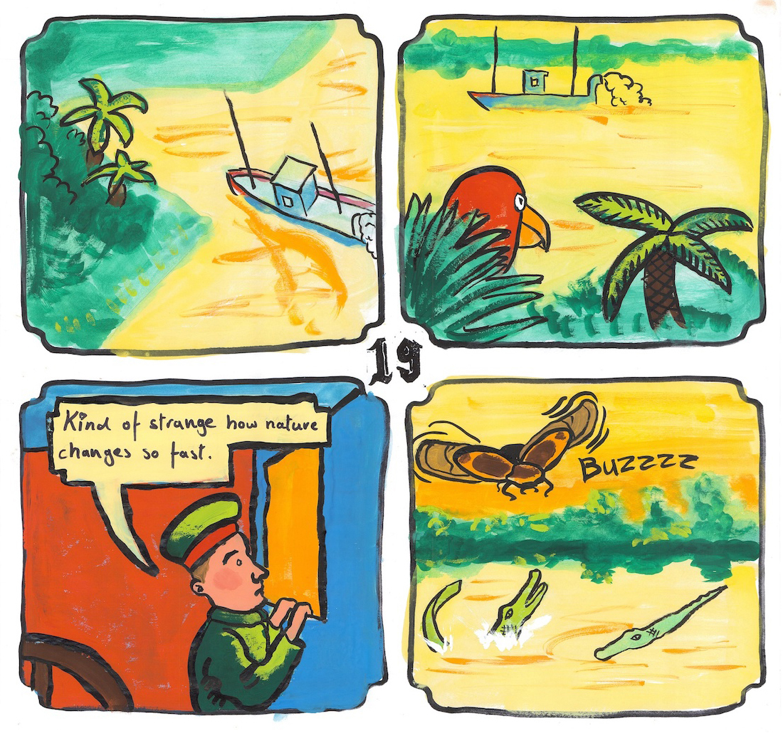 CtB: Het is ook niet de Eerste Wereldoorlog die in mijn werk wordt behandeld. Het zijn slechts elementen uit die oorlog. Ik kan me niet herinneren dat ik palmbomen heb gezien in Verdun, maar ze zitten wel in mijn tekeningen.