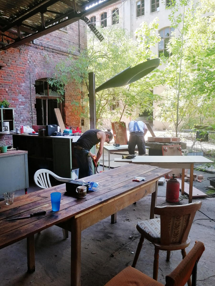 Ondanks dat er geen restricties zijn of bepaalde protocollen bestaan over hoe of wat je zou moeten doen, beginnen de meeste deelnemers met het maken van een soort tijdelijke werkplek vanwaaruit de chaos en de intensiteit van het gebouw beter behapbaar wordt. Zo’n werkplek word dan ingericht met een provisorisch bureautje, gebouwd van een deur en wat pallets. Een oude wankele stoel erbij en dat is het begin van de werkplek. Daarna worden interessante materialen verzameld en naar de werkplekken gesleept. Kleine ideeën worden uitgeprobeerd, in alle kieren en gaten wordt gezocht naar spannende details. Er wordt veel gefotografeerd, geschetst en ideeën worden besproken om van daaruit langzaam een beter overzicht te krijgen van het gebouw en haar mogelijkheden. Het spannende aan dit project is dat de gigantische ruimtes in dit soort complexen de kunstenaars uitdagen om groots te denken en wat dus vaak leidt tot grootschalige, museale installaties, videowerken, performances en monumentale schilderingen.