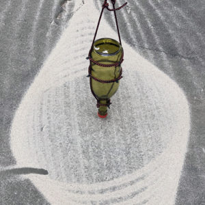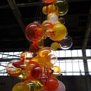 Dat gebruik van de ruimte is een van de leukste dingen hier. Zo duiken er ook ineens op de vloer tegels op van Semna van Ooy, vindt Tonneke Sengers ruimte op een wit paneel tussen twee muren in en kom je in een kamertje ineens een reflecterende draak tegen (Ana Oosting). De glazen ballonnen van Marinke van Zandwijk lijken er nog te hangen van een verjaardag van een fabrieksmedewerker en de pendulefles van PolakvanBekkum gebruikt heel handig de vloer van de voormalige fabriek.