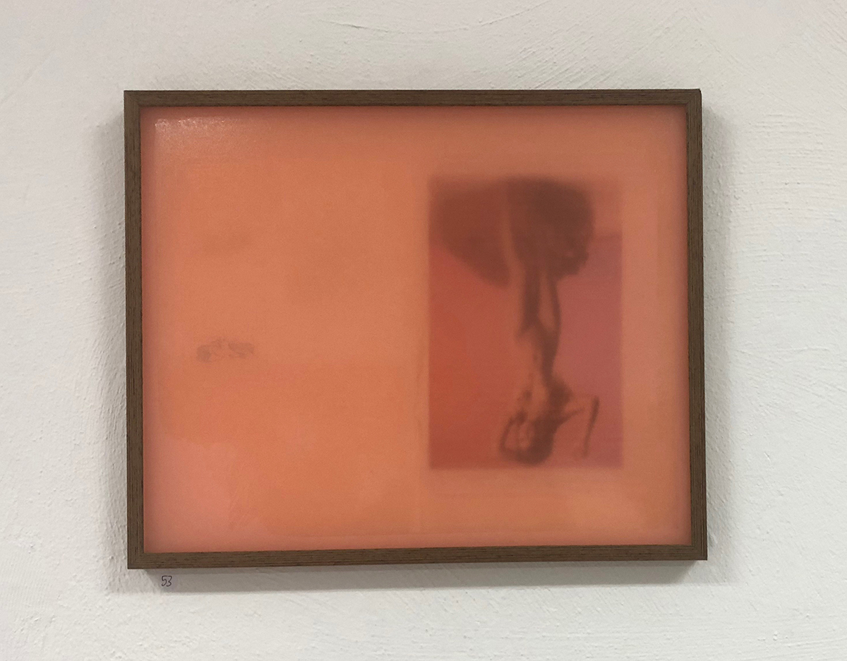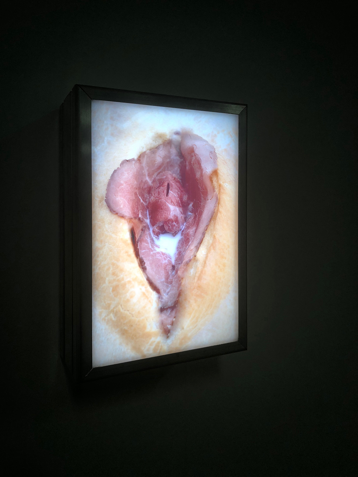 Een werk dat opviel was: ‘Broodje rosbief met melk’ van Mirjam Offringa. Los van de ongemakkelijkheid als toeschouwer, dat ik geconfronteerd word met het vrouwelijk geslachtsdeel en dat associaties oproept naar ‘The origin of the world’ van Gustave Courbet uit 1866, valt het op door het gebruikte medium. Een lichtbak met een foto van een rosbief. Het vlezige waar alle romantiek van ontnomen wordt. Direct, in your face. Subtiel vind ik het werk ‘What Do Pictures Want? The Lives and Loves of Images by W.J.T. Mitchell’ van Pim Tieland. Een omgedraaide afbeelding van een vrouwentorso wordt letterlijk en figuurlijk ondersteund met en door de theorie van W.J.T. Mitchell; dat we plaatjes als levend moeten beschouwen.