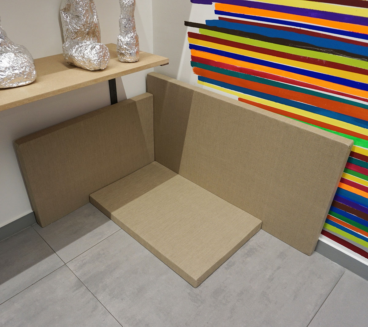Door zomaar ergens in het midden te staan, ontstaan er veel verschillende kijkrichtingen die allemaal op hun beurt weer een variëteit aan perspectieven opleveren. In de tentoonstelling kunnen we daarom ook langs en door dingen heen kijken. Er staan open constructies er in of er achter. Er is een roze geschilderd houten raster met weer een ander kleurrijk wandwerk daar achter. De tentoonstellingsruimte wordt tot in de hoeken benut. En die hoek is dan ook weer een werk. Soms wordt het materiaal ongemoeid gelaten en formeel verwerkt, zoals bij het onbewerkte canvas dat in de ene hoek is opgesteld. En in een andere hoek liggen weer armaturen met zwarte TL-buizen als losse bouwmaterialen. Alsof het de enige plek is waar deze onderdelen even tijdelijk kunnen worden gestald. Maar niets is geïsoleerd zoals we dat in tentoonstellingen gewend zijn, altijd staat er weer iets in de periferie van het object.