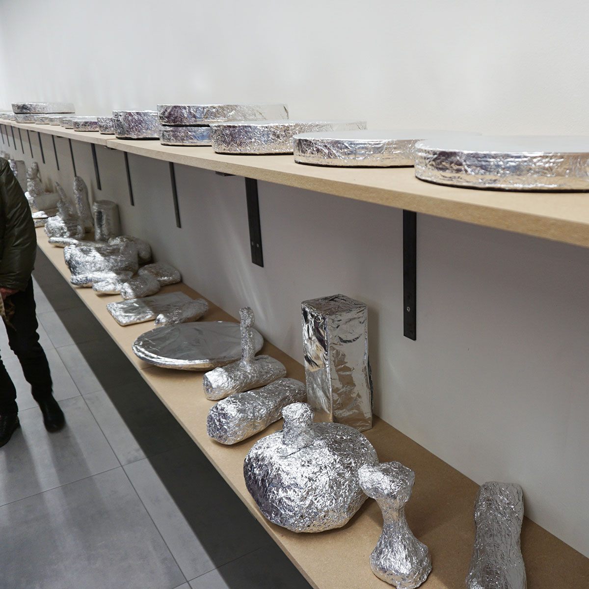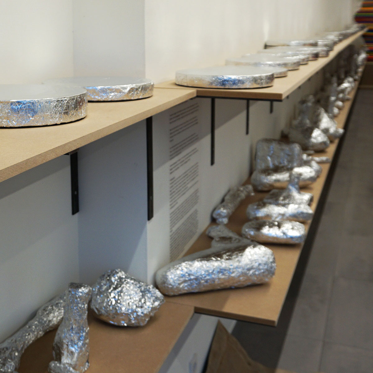 De twee uiterste hoeken van de langwerpige tentoonstellingsruimte zijn verbonden met een lange muur die Van Den Dobbelsteen benut als opbergwand voor een verzameling in aluminiumfolie verpakte objecten. In de wand zit ook een verspringing die in het werk wordt geïntegreerd alsof de oneindigheid van de in serie opgestelde collectie toch nog even moet worden onderbroken. De objecten die op de planken zijn uitgestald lijken er niet heel erg toe te doen. De een is niet pers se interessanter dan de ander. Geen van de objecten lijkt zich kwalitatief te willen onderscheiden.