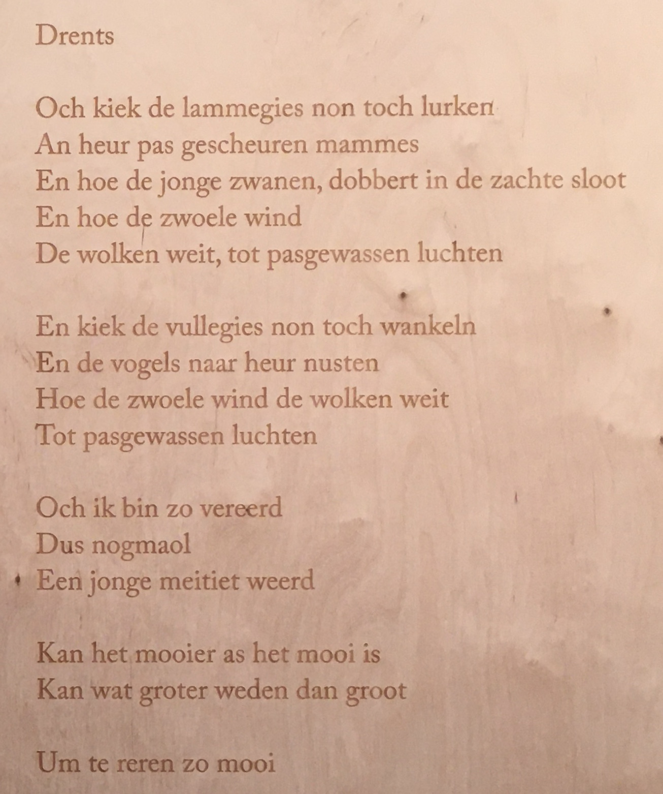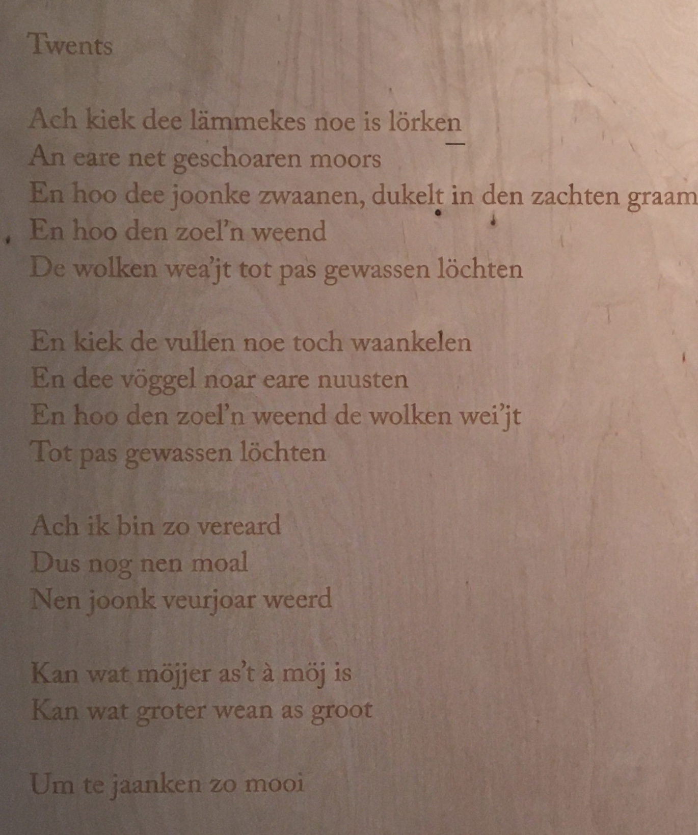 De overeenkomsten tussen de vijf dialectvarianten is voor bezoekers dan ook niet opzienbarend. Spannender is het om te bedenken hoe anderen, mensen die niet bekend zijn met deze dialecten, ertegenaan kijken, en of Daniël met opzet juist deze dialecten vergelijkt, omdat de expositie zich in Enschede afspeelt. Of om na te denken over de grenzen van een dialect: tot hoever reikt het, ook als je het meet in tijd of in generaties..? En… hoe werkt een dialect mee aan de verbondenheid tussen de mensen die het spreken?