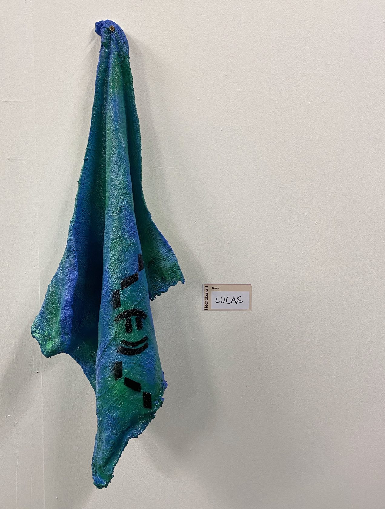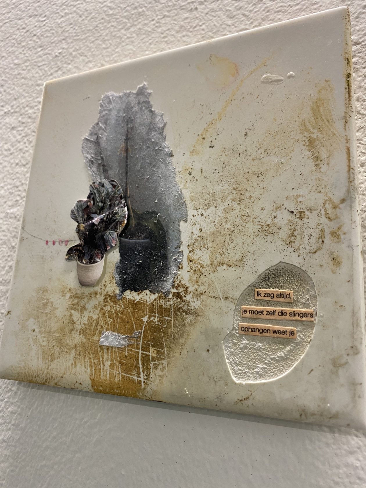 Chantal hangt haar werk op, een hanger van keramiek aan een ketting. “Hocus pocus simsalabim” stond erop. Weet niet waarom, maar voelde mij ertoe aangetrokken. Misschien het idee dat het mij geluk zou kunnen brengen.