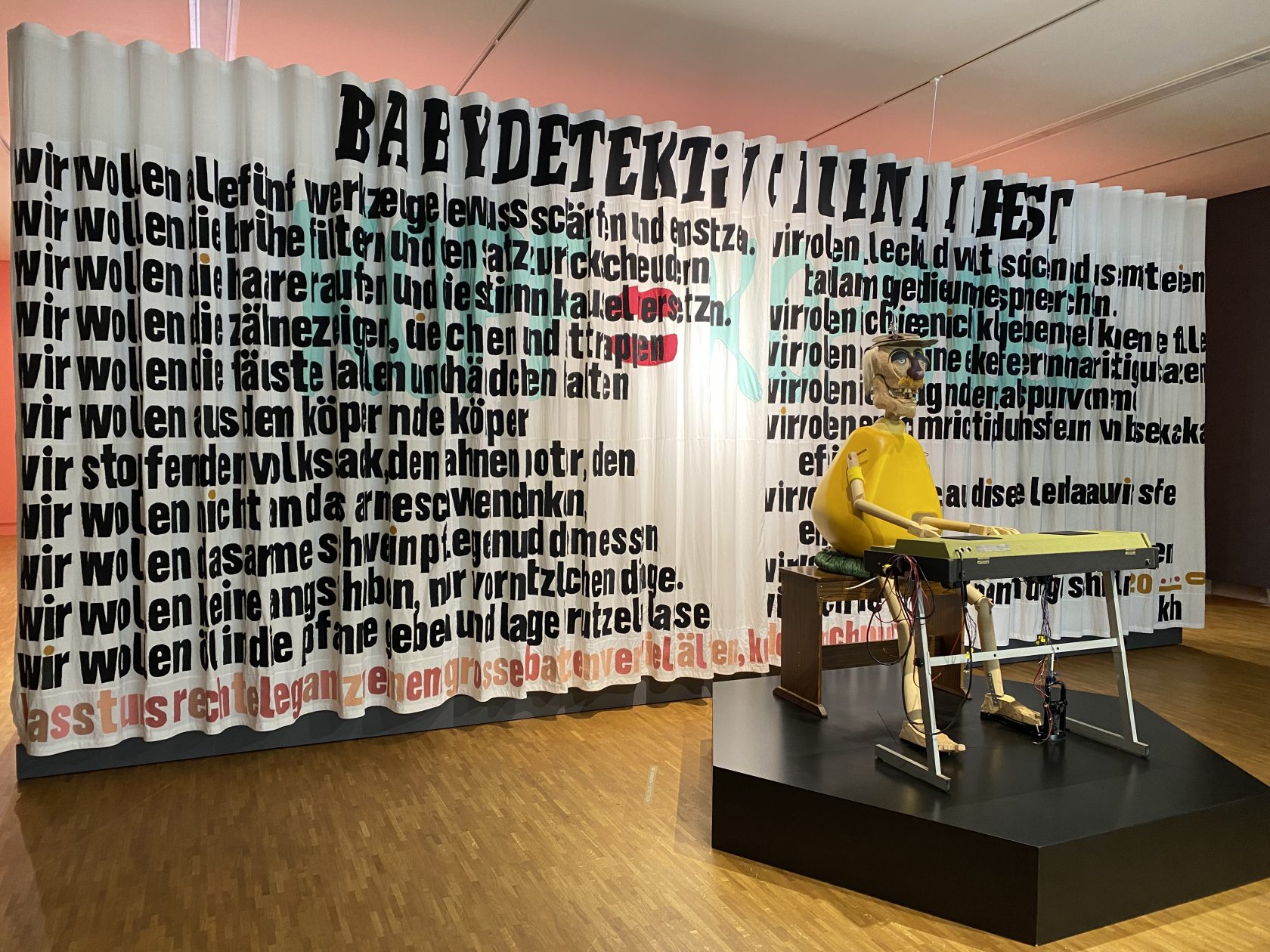 Het betreden van “de grotere ruimte”, gecreëerd met, en verscholen achter een gordijn waarop het manifest van de Babydetectiveclub (een club van bevriende makers met wie Heck af en toe samenwerkt) te lezen is, maakt op mij een overweldigende indruk van grootsheid en kleur, vergelijkbaar met de herinnering die ik heb aan de tentoonstelling van Daniël Richter in 2007 in hetzelfde museum (maar dan in de zalen ernaast, toen het GEM nog twee keer zoveel ruimte bood aan actuele kunst). De taferelen die op het werk zelf te zien zijn, laten zich kort gezegd omschrijven als een wereld waarin de persoonlijke leef- en gedachtewereld van de maker versmelt met de absurditeit die je alleen aantreft in droom en fantasie.