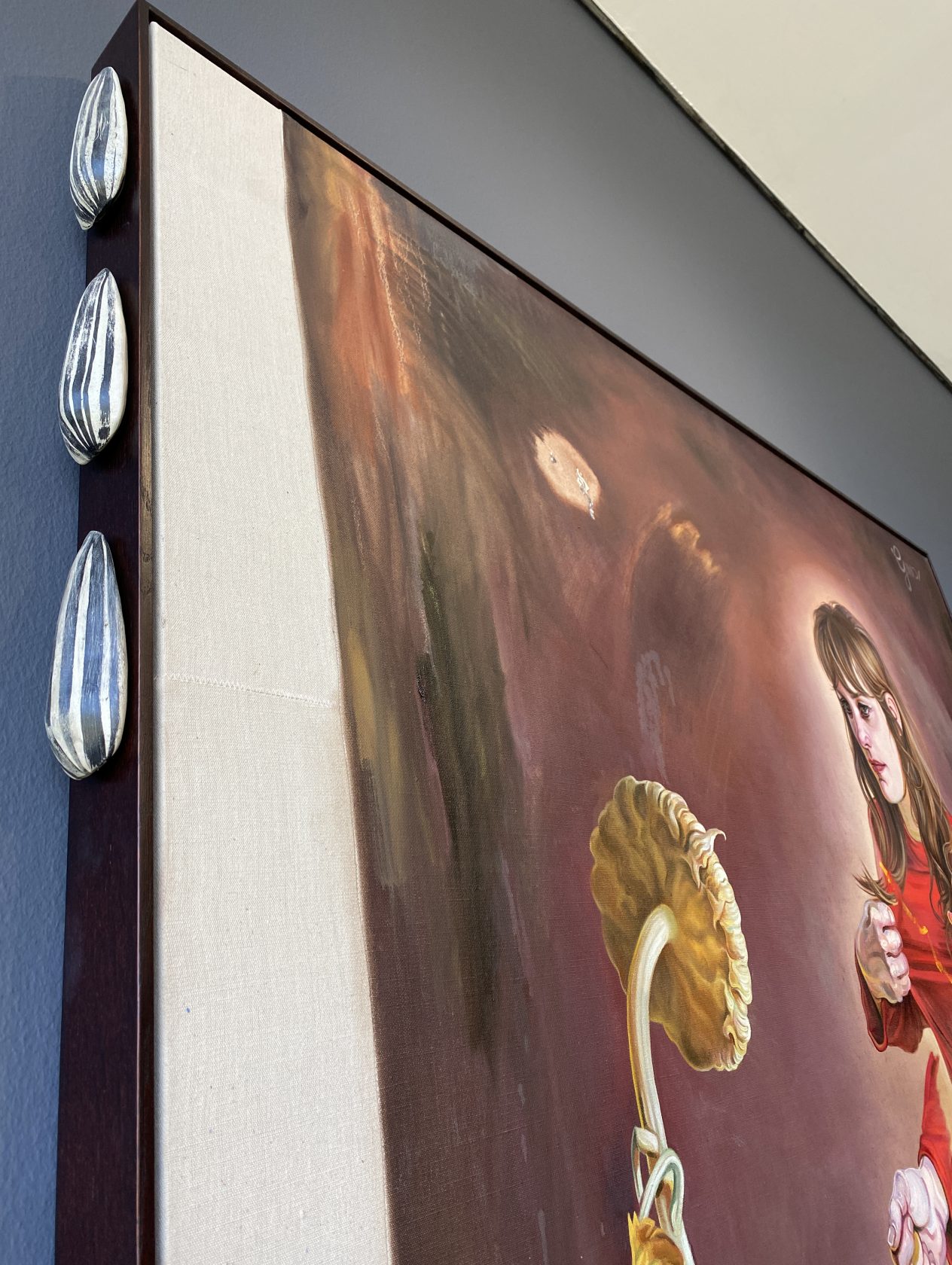 Tot nu toe kende ik Heck’s werk alleen van digitale plaatjes. Wat mij direct opviel bij deze eerste fysieke ontmoeting, was de glans die op verschillende delen van het werk zichtbaar is. Soms als een parelmoerachtige semi-transparante glitterlaag, zoals hier op het lichtere gedeelte, lopend van knie naar bovenbeen (maar dus moeilijk te vangen op digitaal beeld).