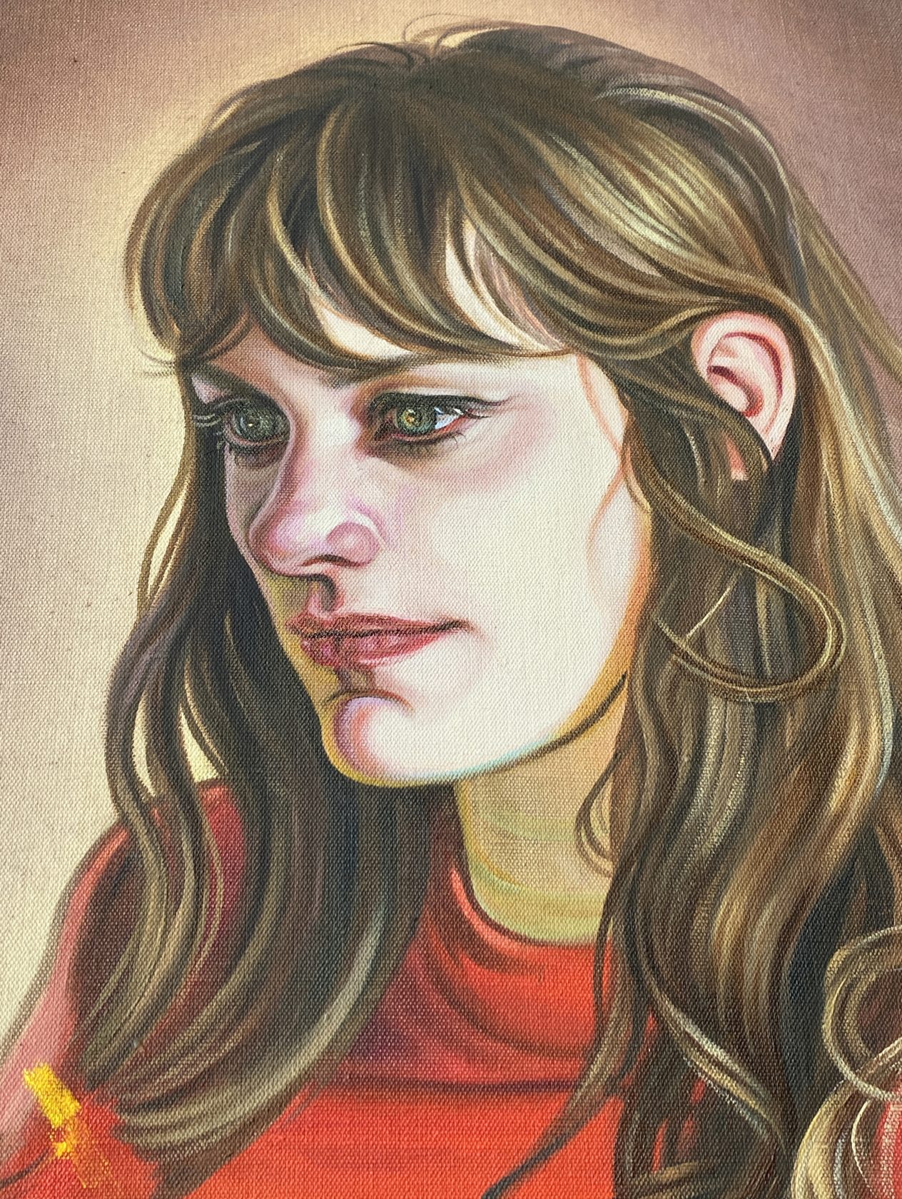 Ook de manier van schilderen maakt dat het werk glimt. De huiduitdrukking met sproeten, dusdanig egaal en glad opgezet als met de perfectie van een photoshop filter. Moeiteloos gaan in hetzelfde werk deze gladde oppervlakten over naar meer expressief schilderachtige delen, of wordt er een lijnvoering gehanteerd zoals we die uit een comic kennen.