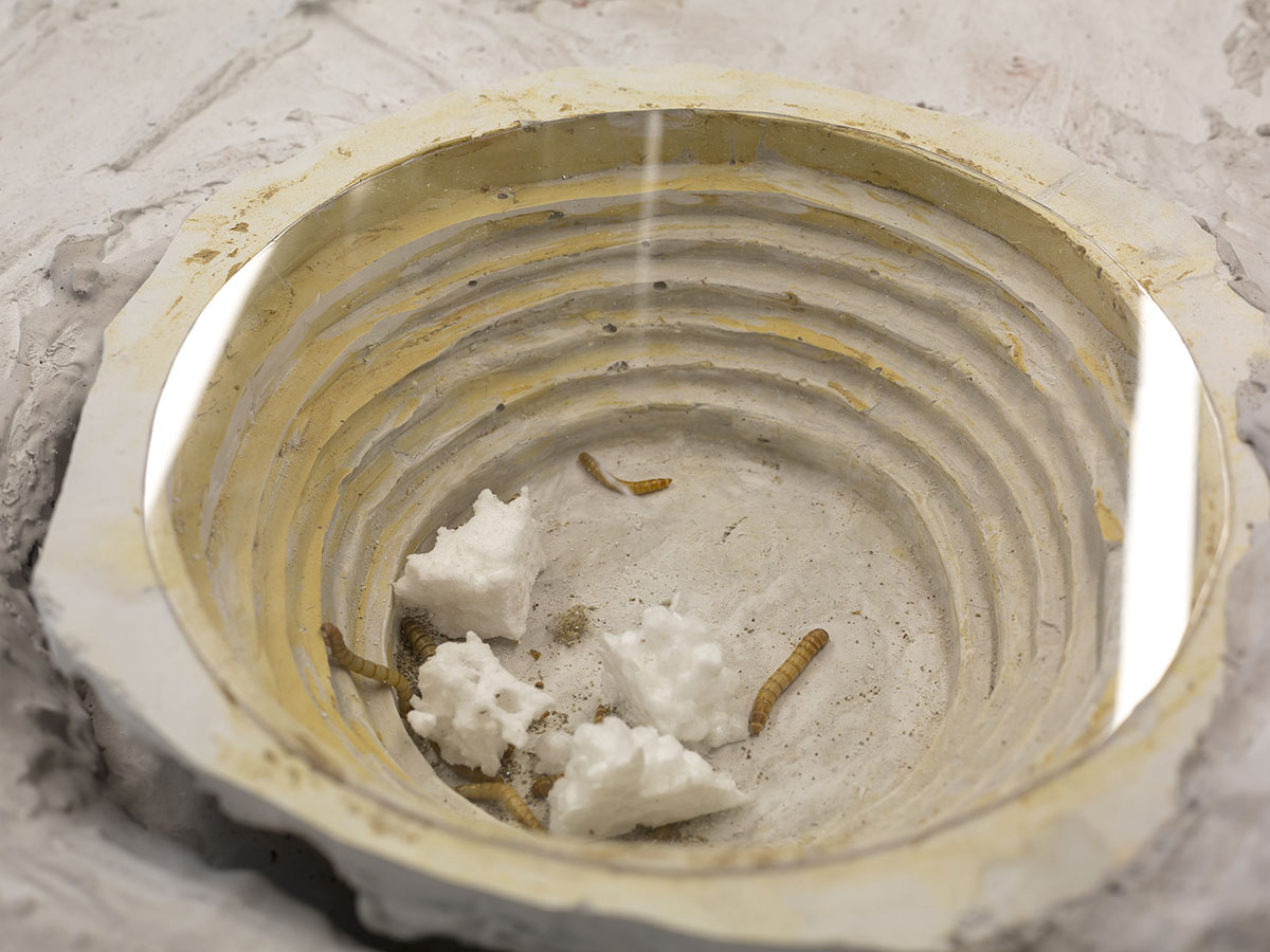 A year ago, I found this little man in a Styrofoam case on a second hand market in Madrid. I got really attached to this object, so I was thinking about making objects in Styrofoam cases at first. But when the corona crises started, I sort of felt like this little man in its casing. It also remembered me of an exhibition I did last year in P////AKT where I had an arena setting of mealworms living on Styrofoam and a bit of water. They eat the Styrofoam, poop it out and eat it again. So I had this fantasy of a fictional character living like a mealworm eating himself into a Styrofoam world. So seeing this object I found that I already had this idea in an image.