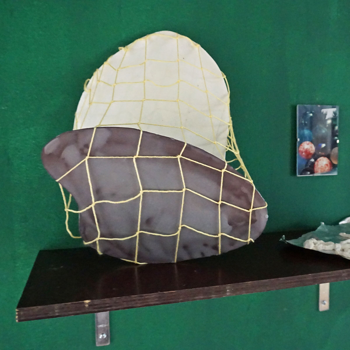 In deze half verduisterde groengeverfde kamer zijn kleine werken aangebracht van Sarah Atzori, Martin Gabriel, Katerina Sidorova, Gijsje Heemskerk en van Konarovská zelf. Voor wie wil weten wat van wie is, ligt er leeg wit vel papier waarop met nummertjes de werken en met lijnen de wanden zijn aangegeven. Maar echt van belang is dat niet, alles is hier namelijk veranderlijk. Belangrijker is dat er weer iets gebeurt. Dat er ruimte is voor dialoog en voor post-coroniaal denken. De ingerichte ruimte doet nog het meest denken aan de oefenkelder van een bandje. Het traditionele vloerkleed dat normaliter ter isolatie onder het drumstel ligt, hangt nu aan de muur en is een wandkleed waarvan de voorstelling eerder als schilderij door het leven ging.