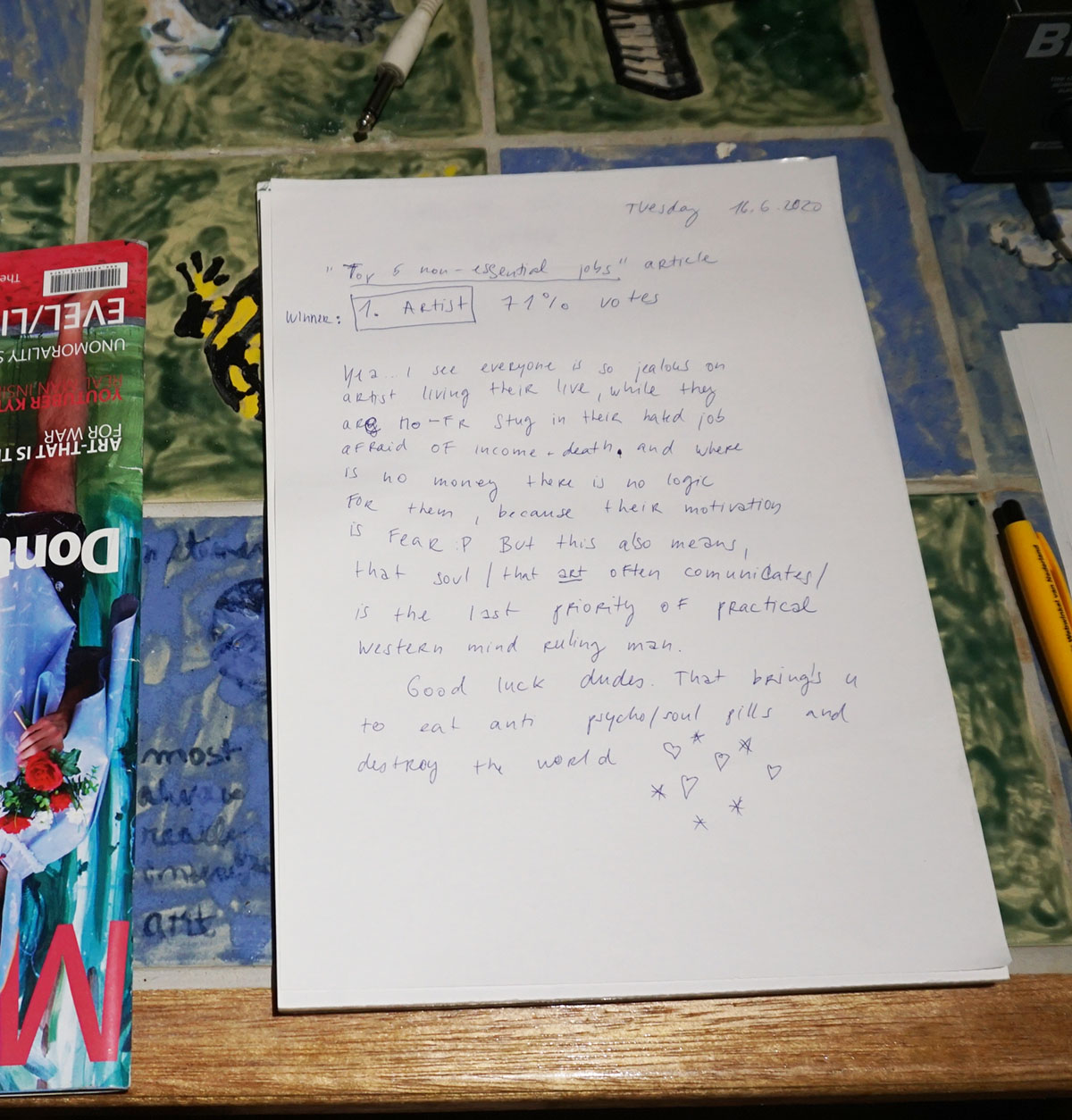 Ik neem plaats op een van de twee oranje zitzakken. Elektronische ritmes en sferische geluiden vullen de ruimte en een enkele ingesproken regel uit de verzamelde werken van beatdichter Allen Ginsberg echoot na. Als dank voor het optreden karaoke-zing ik de door Konarovská zelf geschreven lyrics die in gebrekkig Engels op een beeldscherm verschijnen bij een vage melodie. Zo doen we allemaal een duit in het zakje. Hoewel? De tekst die ik zing gaat over het niet betalen van kunstenaars voor hun werk en het hebben van bijbaantjes. Op de centrale dj-tafel ligt ook nog een uitnodiging tot het schrijven van een brief aan de initiatiefneemster van Escape Room. Konarovská geeft zelf het goede voorbeeld met een tekst die ook gaat over het principe van onbetaald werk van kunstenaars. Om de dialoog voort te zetten, schrijf ik een factuur voor het zingen van het lied bij het karaokescherm. Ik reken 1/12de deel (5 minuten) van een fair practice uurtarief uit op het vel bankpostpapier, wat leidt tot de nodige hilariteit bij de aanwezige kunstenaars.