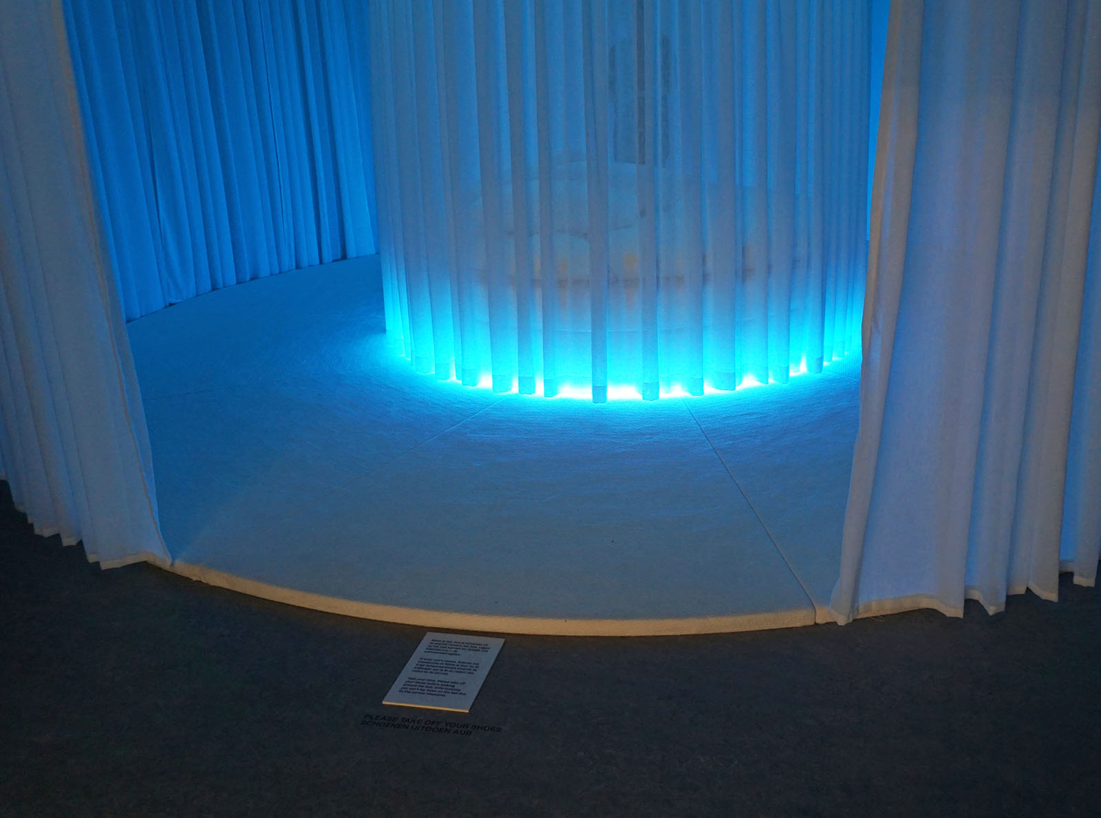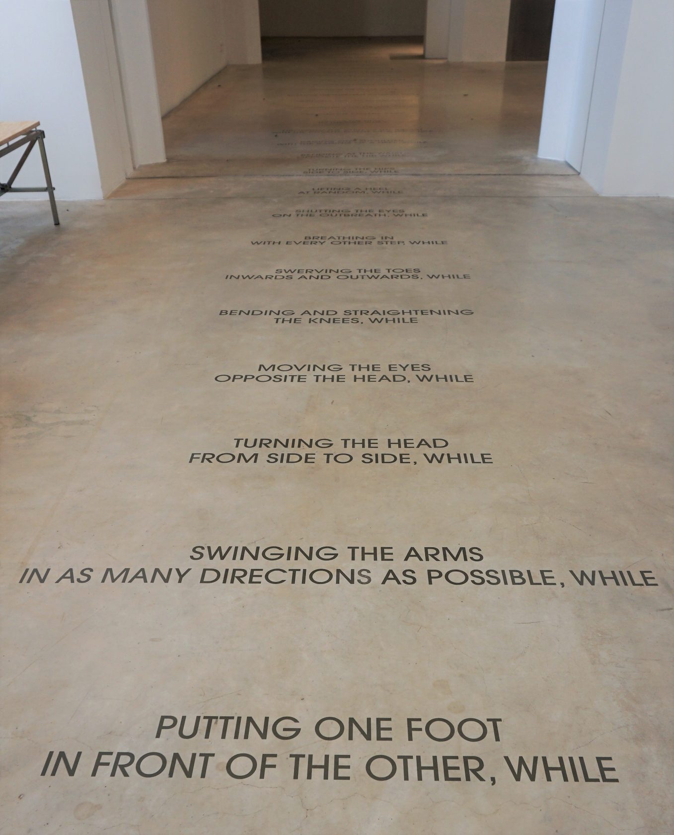 Het betreden van de nieuwbouw van archtitect Francesca Torzo is met de openingstentoonstelling een heel ritueel geworden. Het begint met een instructie van William Forsythe op de betonnen vloer. Stap voor stap lezen we de aanwijzingen die dienen aan te zetten tot een performatieve vorm van lopen. Een werk waarin de samenhang tussen volgzaamheid, expressiviteit en schaamte van de bezoeker op de proef wordt gesteld. Ook het tweede werk op de route is textueel en site-specific. Een smalle maar steeds breder wordende duistere toegangscorridor vormt een interessante perspectivische ruimte voor een entreewerk. Lotte van Audenaeren heeft er enkele oplichtende teksten aangebracht die als losse elementen de ruimte verkennen.