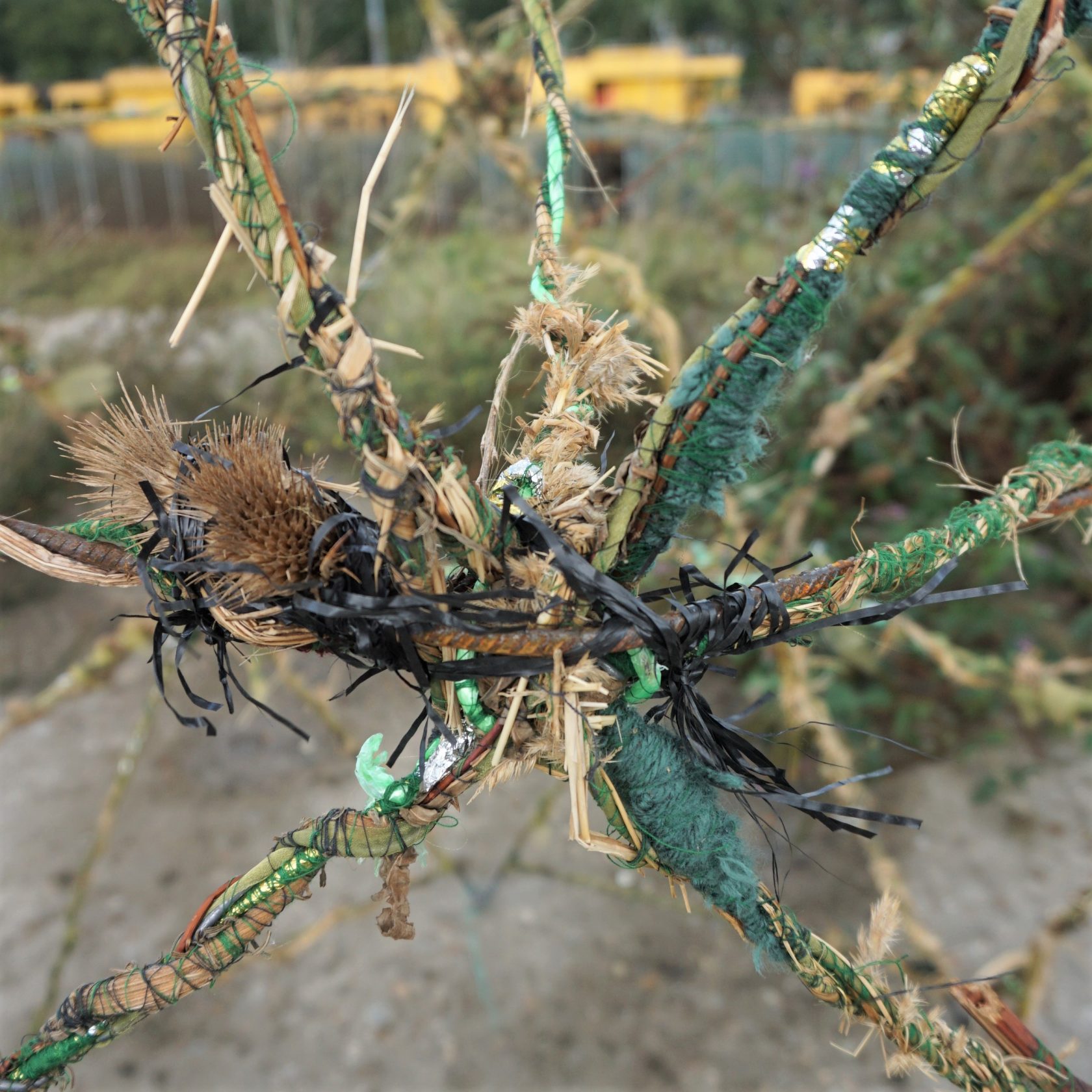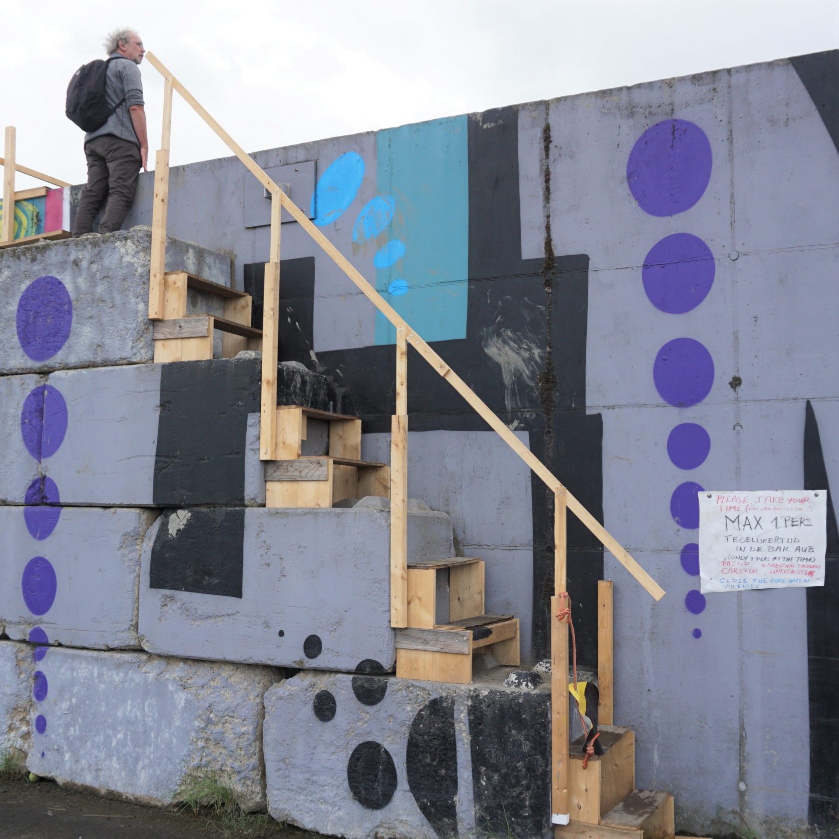 Pim Palsgraaf daarentegen kiest voor volume en bouwt zowel op het water als op betonblokken onverstoord verder aan zijn architectonische houten constructies. Ook Daan Botlek staat met beide benen op de grond en schildert grote betonblokken tot gele sponzen of schuimblokken die als snoep worden verkocht. Maar boven op de betonberg steekt weer het ranke gewas van Leslie Nagel in de lucht. Het weinige groen dat op Betonplaat te vinden is, heeft ze verwerkt tot een toren die speelt met de wind.