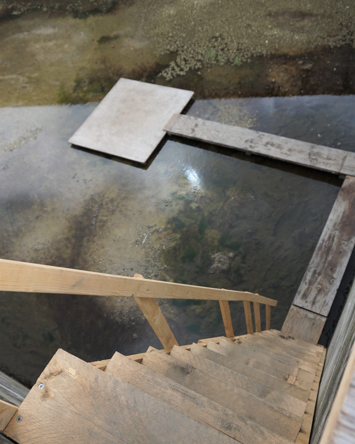 Ties Ten Bosch is de minimalist van het gezelschap. Hij voegt niet zozeer toe maar leegt een open reservoir en nodigt de bezoeker uit om middels zijn trap-, steiger- en platformconstructie in de open bak te staan en de leegte te ervaren. Zijn werk contrasteert sterk met de ingrepen van Toine Klaassen die zo ongeveer elke tak, steen of waterdruppel op het terrein heeft aangeraakt om greep te krijgen op deze heilige plek. Als een sjamaan voert hij performatieve rituelen uit waarbij zowel zijn zelfgebouwde verblijfplaats als de aangebrachte opstellingen en ordeningen in bewegen blijven, en ook gedurende de eindpresentatie continu veranderen.