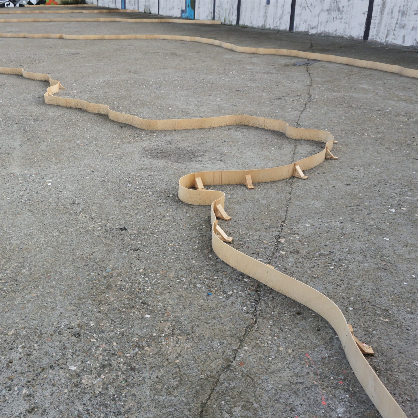 Zo bouwt Michiel Jansen een driesteensgolfbreker die in het midden dieper in het water zakt en verhoogt Willem Besselink met stokken de ondergelopen betonvloer tot ongeveer een meter boven ‘NRP’ (Nieuw Rotterdams Peil). De golven van het wateroppervlak zijn als tweede werk door hem op het droge gelegd en worden triplex lijnen van een getekende hoogtekaart, rechtop gehouden door een grote hoeveelheid houten boekensteuntjes die een voor een in het oplopende beton zijn geboord en vanaf de achterkant een prachtig beeld opleveren.