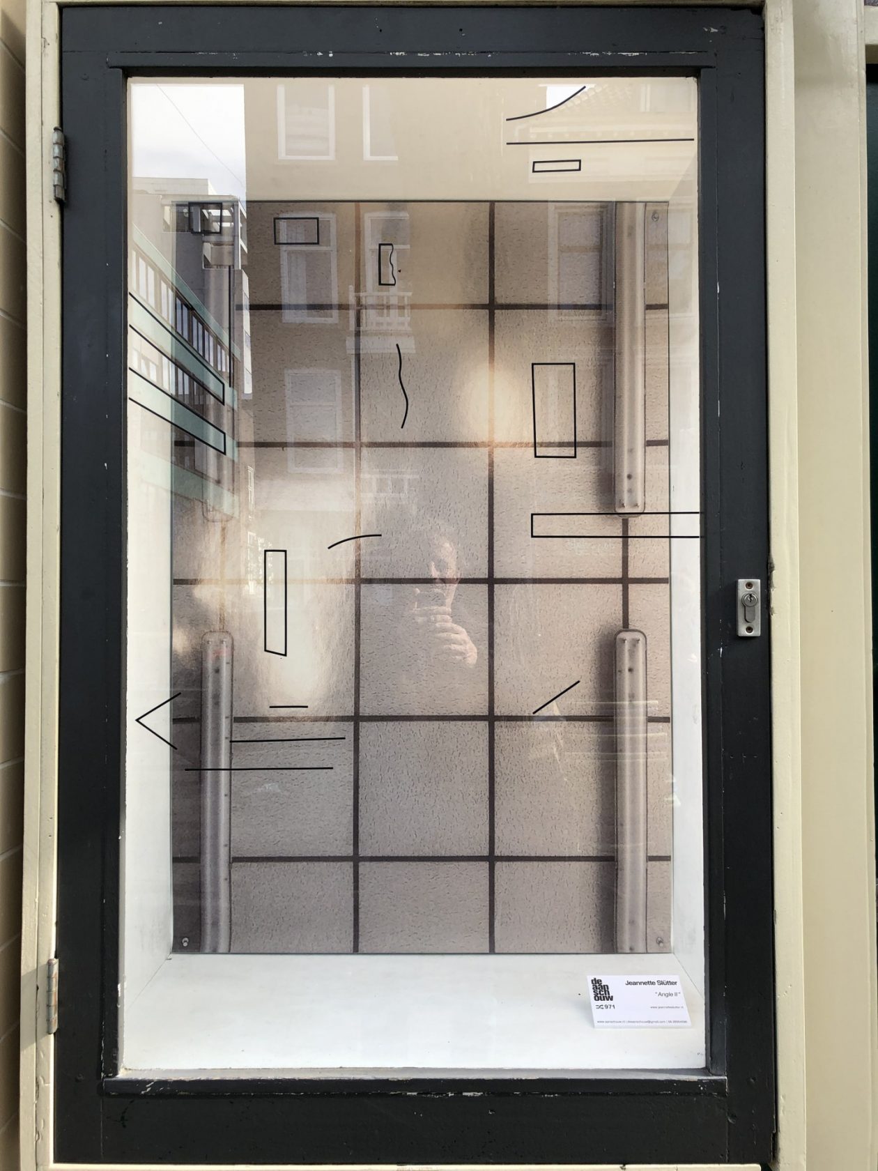 Slütter: The last work I made, for the Aanschouw in Rotterdam, was reaching this point. It exists as a photo of a ceiling, presented in the window pane [on the street]. It is a matte print with light stains on it. Above it, you can see adhesive stripes on the window that emphasize the reflection. You can mainly see the reflection when you see the documentation [online]. It is very important that the person who normally takes the photo, will actually take it: after all, he has the right length to place the stripes in the right place [of his camera]. But what you don’t see, if you only see the photo of the photo, is that the light reflection on the print is fake. You only see that on the spot itself, in front of the Aanschouw, when you move and see that the reflection doesn’t move along. Then you surely get these different layers of seeing.