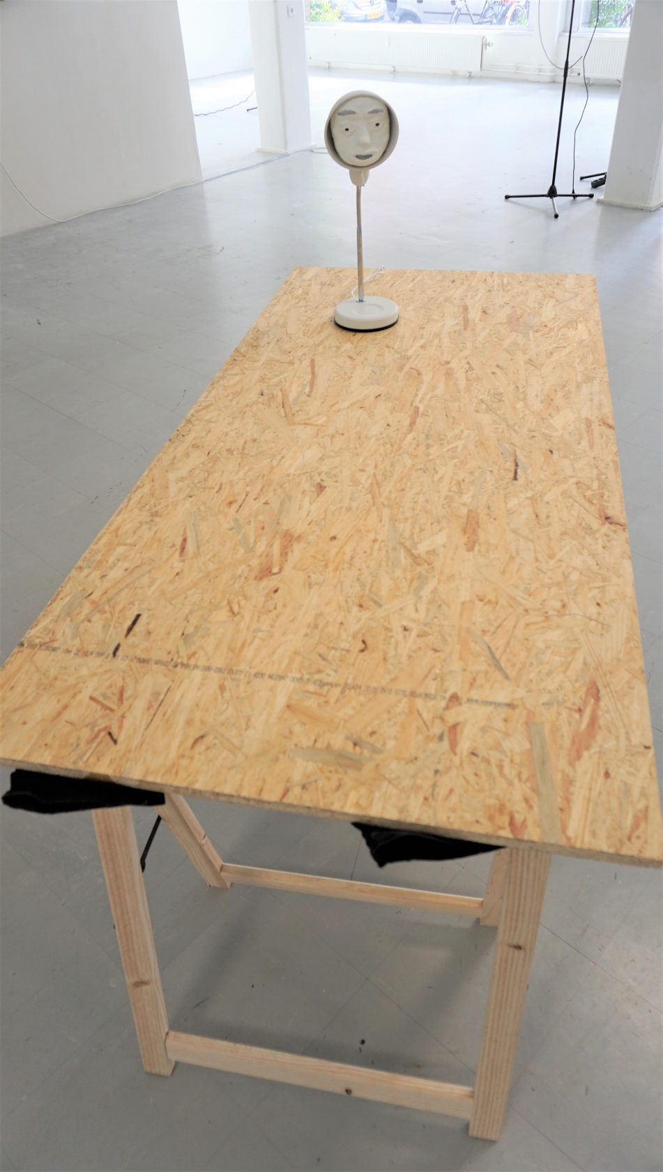 Ook Brigitte Louter gaat verder op de ingeslagen weg en toont een hoekwerk dat een nieuwe dubbele pagina lijkt uit haar persoonlijke ‘encyclopedia of all world knowledge’. Uit het lijnenspel maak ik op dat ze nieuwe ontdekkingen gedaan heeft over de invloed van de opkomende zon op de neerwaartste regenval. Lucas van Eeden maakt optimaal gebruik van de mogelijkheden die de extra ruimte in The Grey Space biedt. Ideeën worden snel verwerkt tot installaties uit eenvoudige materialen. Midden in de tentoonstelling staat een houten plank met een gezicht tegen een pilaar geleund en een bureauopstelling van ‘plaat op schraag’, dat als lichaam voor een eenvoudig kledingsetje (spijkerbroek en t-shirt) dienst doet en dat alleen van onderen te zien is. De bureaulamp op de tafel herbergt het gezicht.