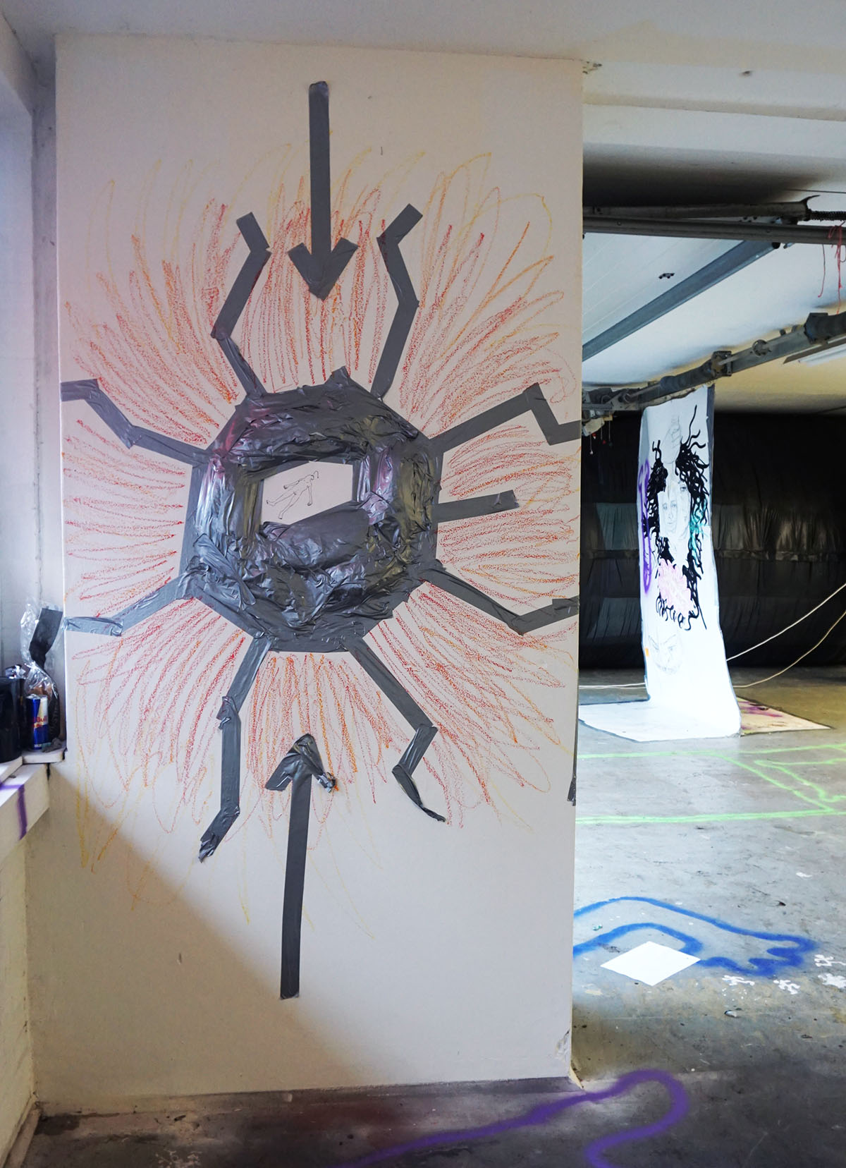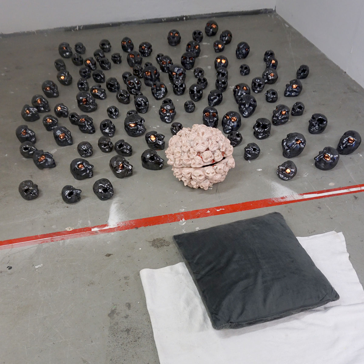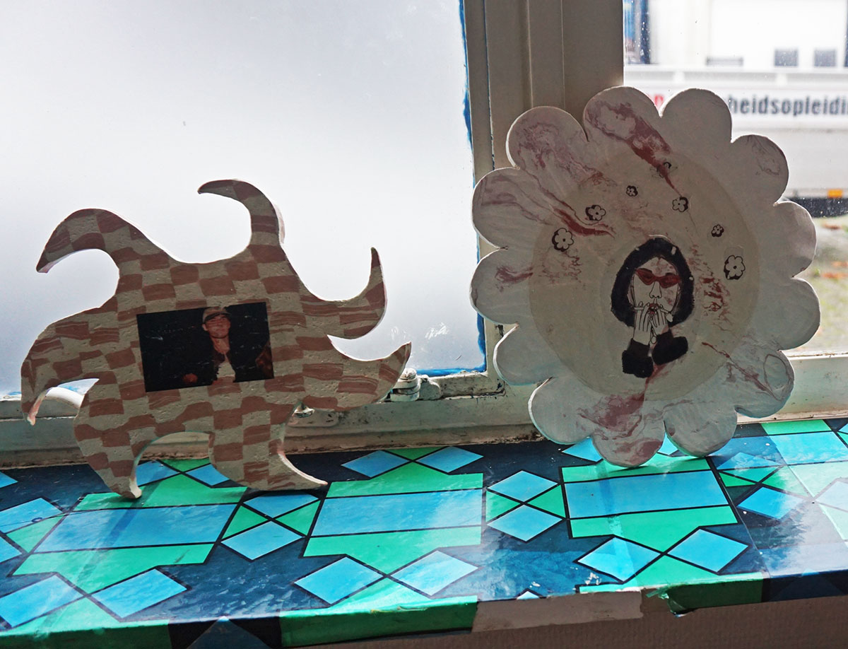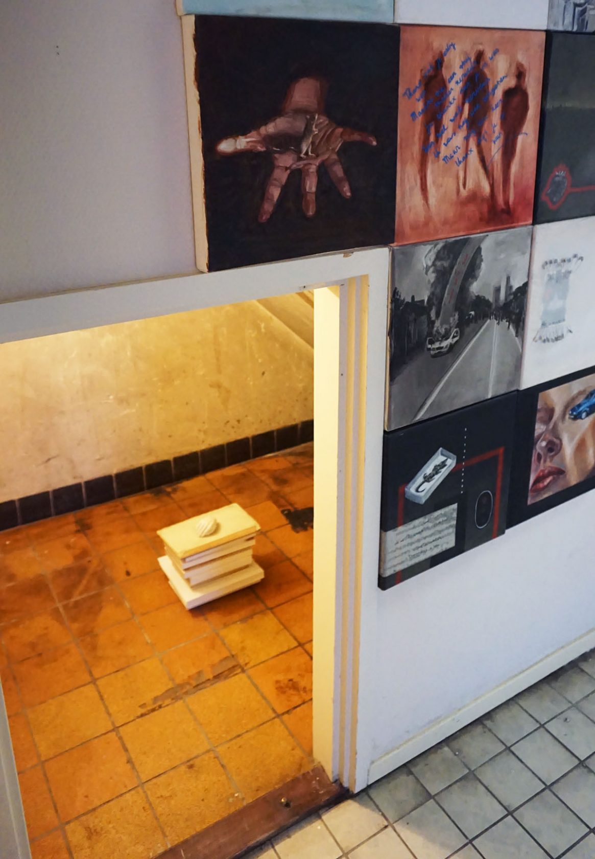 Grape Jelly Pie speelt zich af in een verlaten kantoorruimte dat, met de aanwezigheid van een podium en keuken, ook wel iets wegheeft van een buurthuis. De sfeer is er een stuk gemoedelijker dan in de Sweet Jelly Pie garage. Hier lijkt alles wat meer bedachtzaam en verstild. Alsof deze kunstenaars meer tijd hebben gehad om te reflecteren en tot zichzelf te komen. Hoewel we dezelfde thema’s terug zien komen (lichamelijkheid, seksualiteit, social media, de omgang met de dagelijkse realiteit) wordt er minder gereageerd en meer geordend. En er is afleiding in de vorm van rituelen en een videogame. In de achterruimte is ook plaats gemaakt voor een goed gesprek. De installatie van Bo Wielders herbergt een radiostudio voor Mushroom Pie Radio waar gesprekken worden gevoerd over kunst en andere zaken.