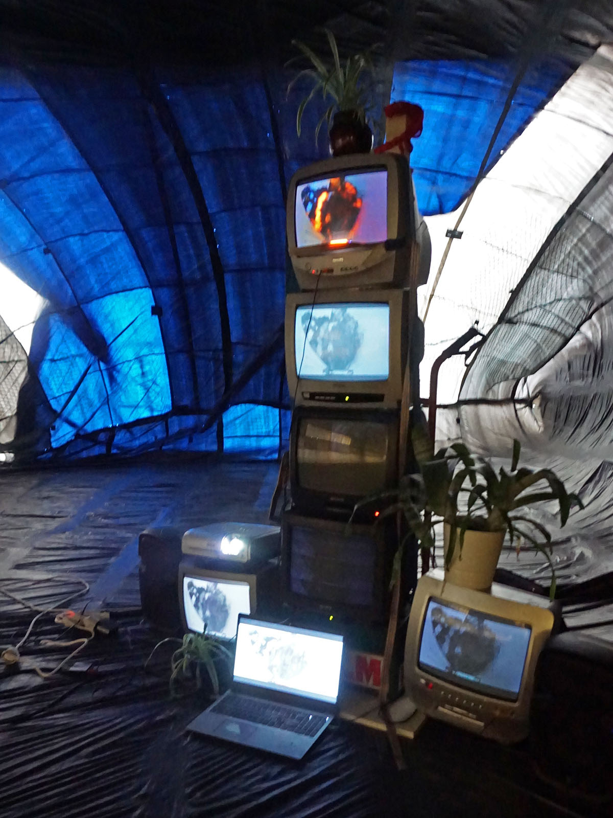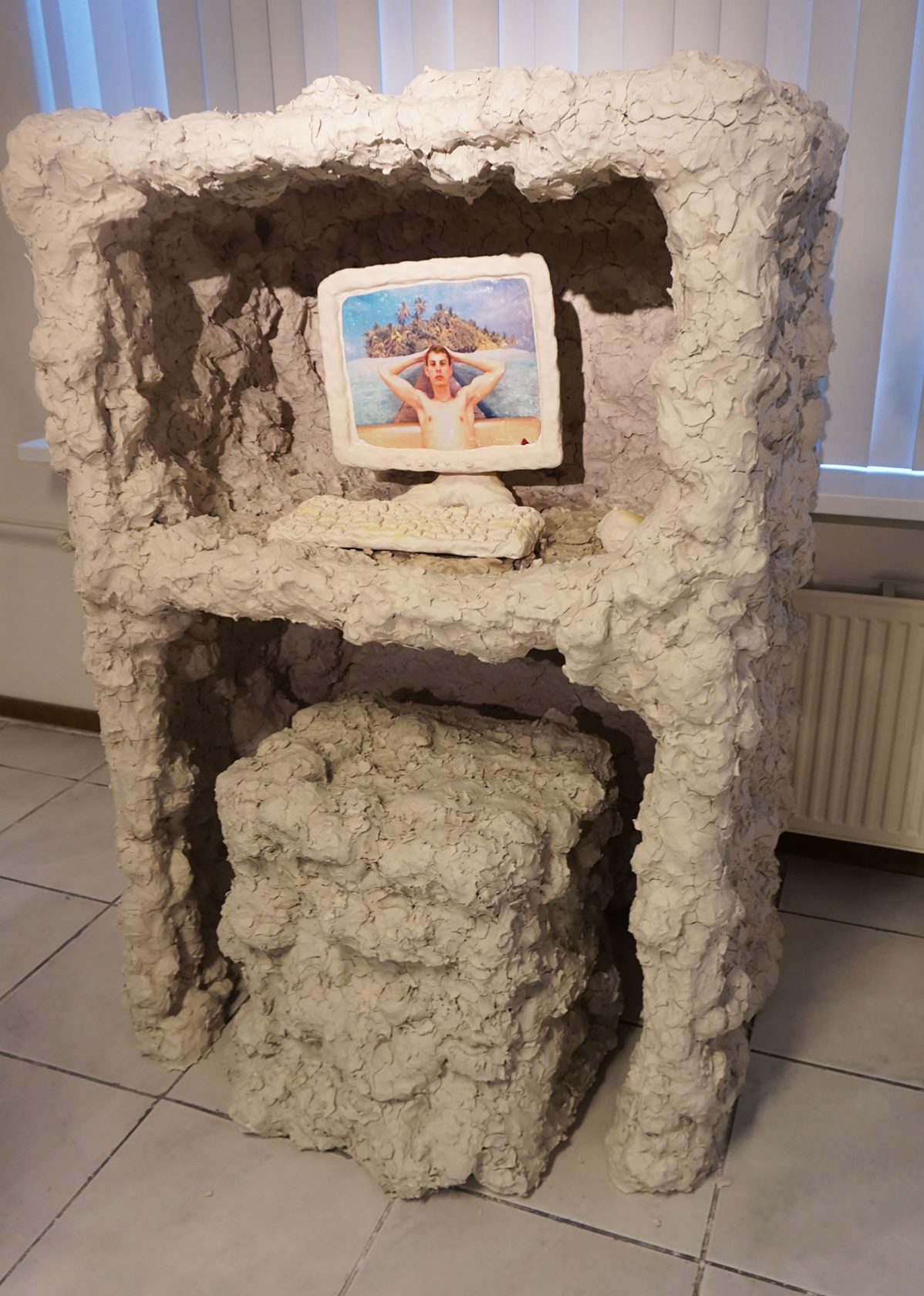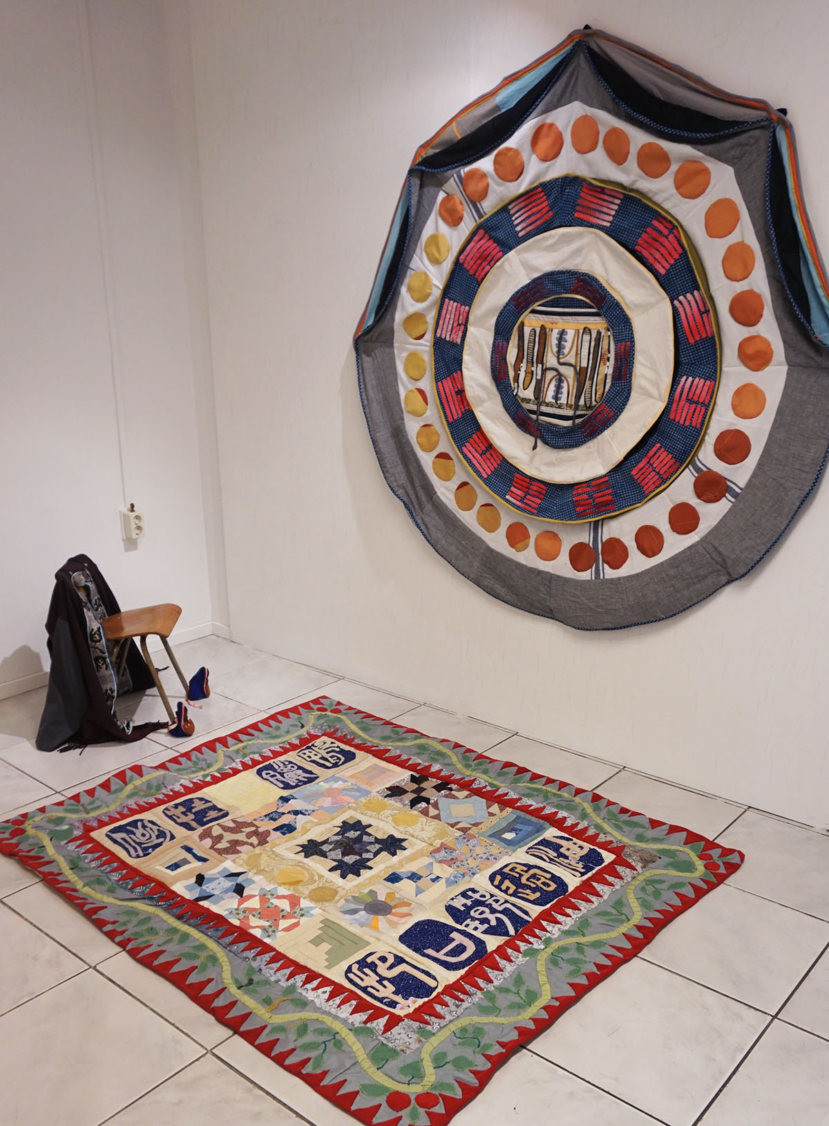 Grape Jelly Pie speelt zich af in een verlaten kantoorruimte dat, met de aanwezigheid van een podium en keuken, ook wel iets wegheeft van een buurthuis. De sfeer is er een stuk gemoedelijker dan in de Sweet Jelly Pie garage. Hier lijkt alles wat meer bedachtzaam en verstild. Alsof deze kunstenaars meer tijd hebben gehad om te reflecteren en tot zichzelf te komen. Hoewel we dezelfde thema’s terug zien komen (lichamelijkheid, seksualiteit, social media, de omgang met de dagelijkse realiteit) wordt er minder gereageerd en meer geordend. En er is afleiding in de vorm van rituelen en een videogame. In de achterruimte is ook plaats gemaakt voor een goed gesprek. De installatie van Bo Wielders herbergt een radiostudio voor Mushroom Pie Radio waar gesprekken worden gevoerd over kunst en andere zaken.