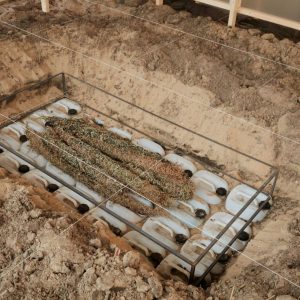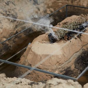 In het centrale ‘graf’, een soort altaar, lag een bundel bijvoet te smeulen. Die vulde ik voortdurend aan. Daardoor hing er een penetrante geur en vulde dit deel van het tafereel zich steeds verder met as en halfverbrande plantresten.
