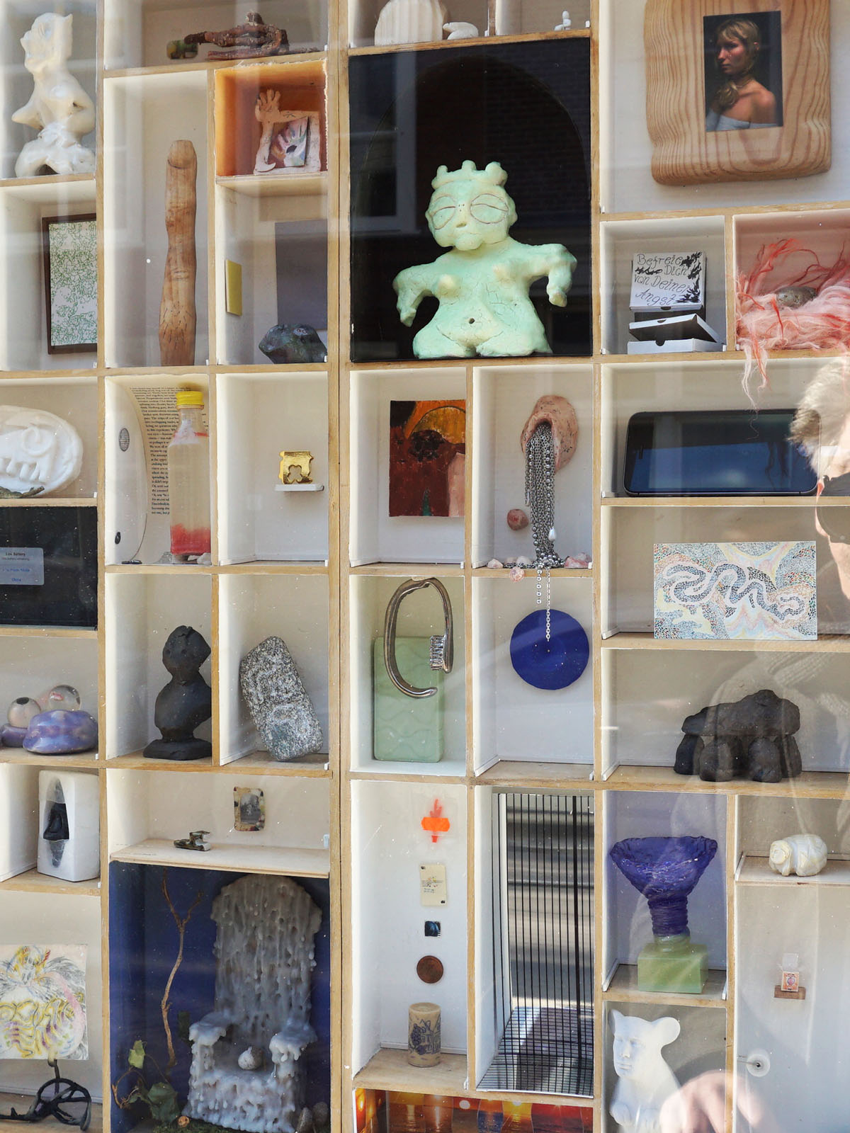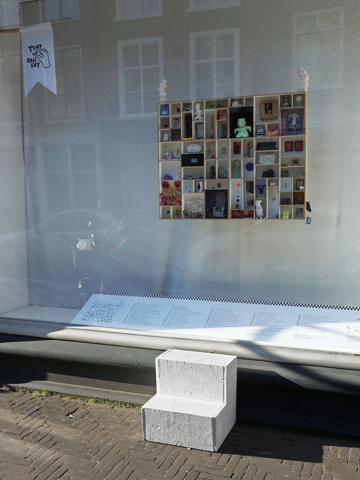 En onderweg komen we Tiny Art Gallery weer tegen. Het initiatief, dat vorig jaar startte in reactie op de eerste lockdown en waarover we eerder schreven in ons overzicht van quarantaine-initiatieven, blijkt nu met een tweede editie op een nieuwe locatie op te duiken. Met nu nog meer vakken die door vaak jonge kunstenaars worden gevuld. En ze lijken ook al iets minder ‘tiny’ dan voorheen. Voor de kleinere kijkers is er zelfs een opstapje toegevoegd. Service van de zaak.
