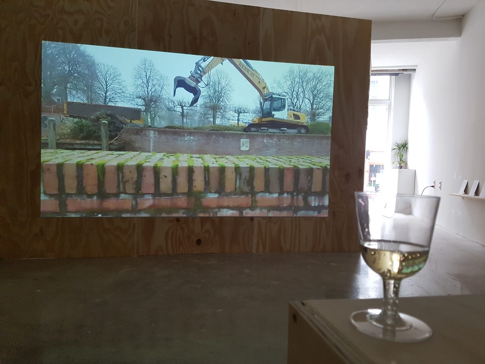 Central in the exhibition space there is a plywood wall that separates the space into two; on the one side you find a pallet with a pile of newspapers and on the other side the wall is used to project a video on. Two surprisingly comfortable plywood seats are available for watching the video documentation. As per usual the spectator is warmly welcomed by members of het resort with a glass of cava, which has become something of a signature move of theirs. So as you take a seat, cushioned and with a glass of cava in hand, you are ready to take in the full 35 minutes of the video documentation. The video shows him delivering newspapers in the village of Pekela and is shot from a camera mounted on an old fashioned mailman trolley that Scholten managed to buy on Marktplaats. The sound of that trolley in the video is absolutely deafening and makes it sometimes hard to hear what is being said. Occasionally you hear Scholten talking to the curious locals, explaining what he is doing and sometimes he reflects on his own project while delivering newspapers. It also offers many insights into the daily life of the village; kids playing around, people looking at a waterside deck being demolished, etc. He also briefly shows a clip of him being interviewed by the local news outlet RTV Noord. Considering the video was shot in December 2020, the vistas are what you would kind of expect from the countryside of Groningen if you are familiar with it; a bit drab, grey and very humid.