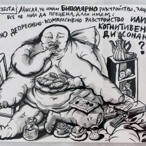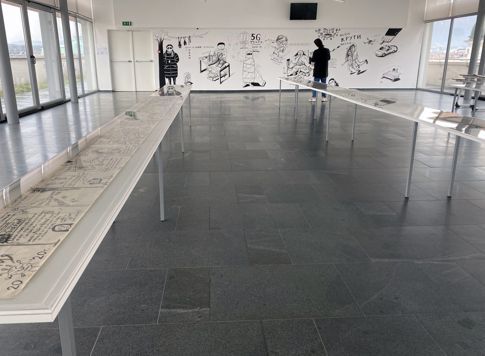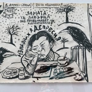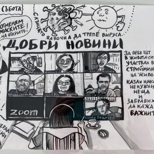 A couple of floors up was an exhibition by Alla Georgieva, who since the corona crisis revealed itself in Bulgaria, has kept a diary in drawings in East Indian ink that shows in what ways this period has affected our daily lives. Recognizable to many of us, from Zoom meetings to conspiracy theories and Corona kilos; Georgieva elaborated on it all, often with a lot of self-mockery and humor.