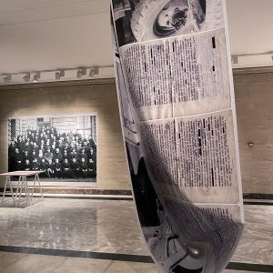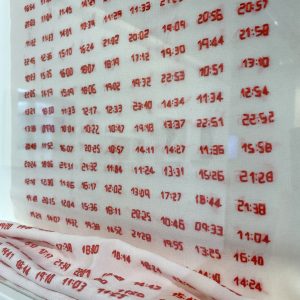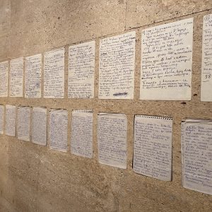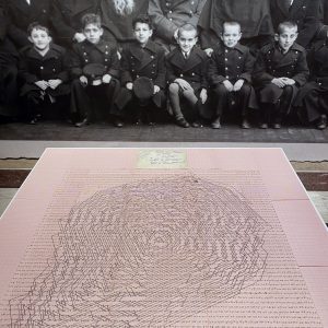 ‘This clear – cut World died without leaving behind it a Charnel House’, a solo exhibition by Radostin Sedevchev, was on at The National Gallery, Kvadrat 500. Walking through the exhibition, I felt like a voyeur nosing through the secret notes of a detective working on unraveling a big family mystery. In this, images from found family archives of diary excerpts seemed to correspond to holiday pictures of a couple in an Italian city in the 1960s. On a banner hanging in a loop from ceiling to floor were enlarged copies of documents that reminded me of the pages from the archives of the former secret services from my father’s file, the names erased with black marker. The texts, in fact, were all in Bulgarian, a language I still don’t manage to decipher, which must have influenced my perception. A numbered grid of square millimeters on paper, contained a drawing that connected these numbers according to a certain pattern. It looked like a complicated calculation which I automatically related to the inflated portrait picture hanging behind it of a large group of men and young boys from, I guess, the 1930s. Later, I understood, that the pattern is related to the moves of the knight in chess. The connection with the picture I like to dream of and hopefully will remain veiled in mystery for me.