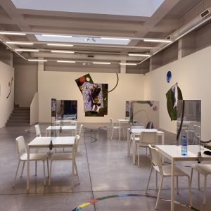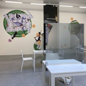 As I enter the room, the first thing I notice are the tables, sterile white and square, arranged as in a visitors’ room or cafeteria. A glass plate, fixed to the edges of the tables with sturdy clamps, divides them in two, with a chair on each side. The material of the glass plate has the alienating abilities of half-reflection and transparency, mixing the image of the person sitting across with your own reflection. It automatically initiates a game in which everyone in the room participates, which is a beautiful (and sad) representation of the transformation that a bigger part of the social contact of humanity has necessarily undergone in the past year. Taking a seat at the table with “your counterpart” on the other side of the glass, also reminded me of visiting hours in a high security prison, a setting I only know from movies and television. The circles, referring to the circles sprayed on the grass in the parks to keep people aware of social distancing in a collage of people picnicking in the sun, running from the gallery floor to the wall, almost make you believe that nothing is going on in this world, until you wake up again.