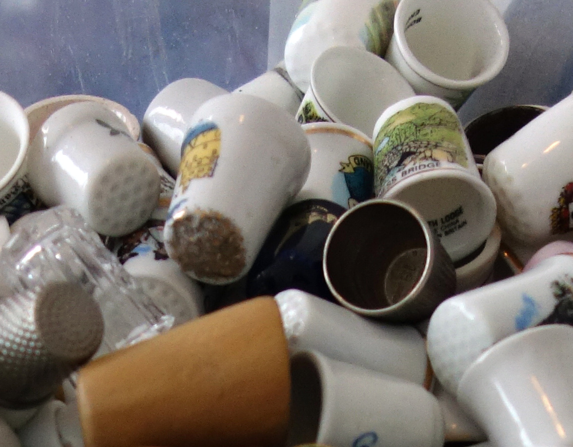 Ik heb wel een fascinatie voor zulke gebruiksartikelen. Daar zie je nog een krat met gebruikte vingerhoedjes. Misschien geef ik mezelf een cursus cadeau en ga ik ze in het groot namaken. Of doe ik een fotopresentatie over de kwetsbaarheid van een vingerhoedje. Gebruikte wandelstokken zijn een ander ongoing project. Omdat ze bij het klussen hier onder het stof kwamen, heb ik ze nu tijdelijk in kratten opgeborgen. Dat zijn er een stuk of 900. Als ik er een stuk of 1000 heb, wil ik er ook een presentatie van maken.