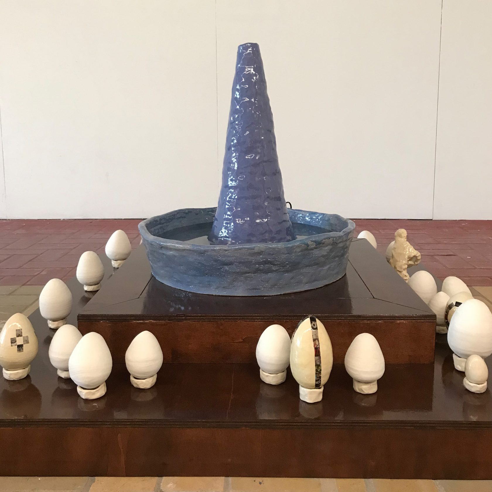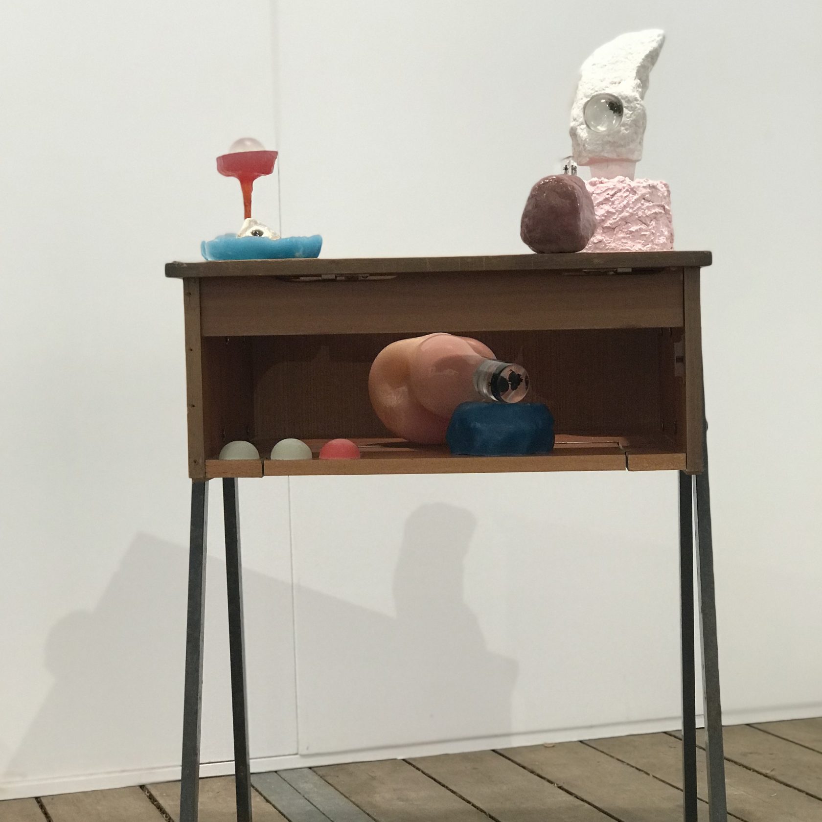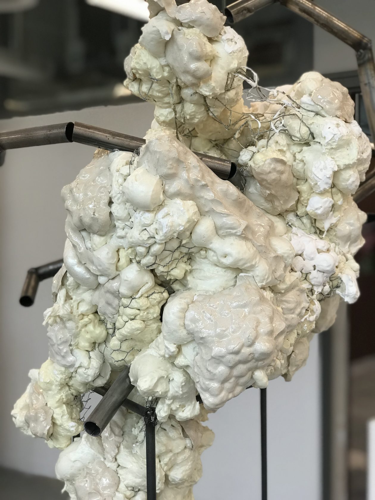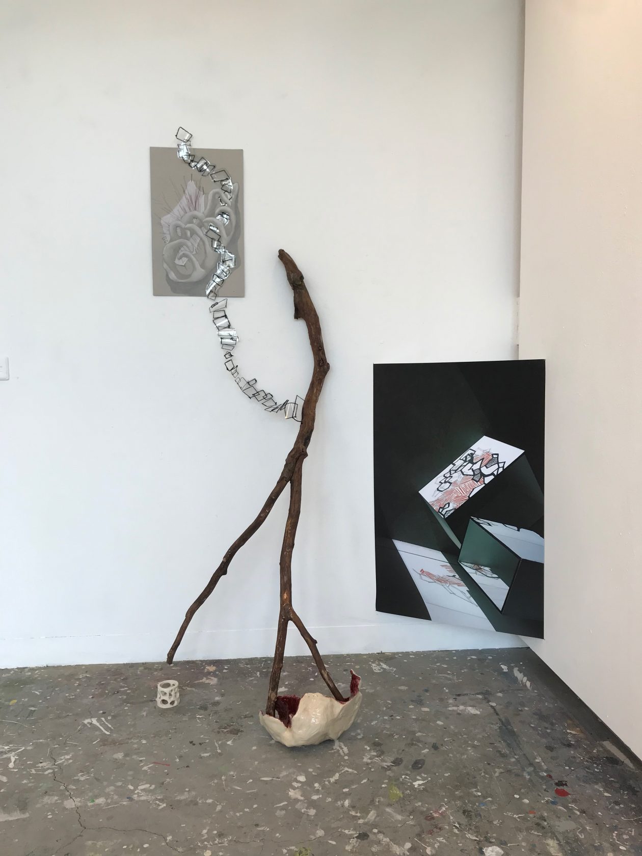In het werk van de nieuwste lichting viel het herhaaldelijk gebruik van keramiek op. Alsof er een nieuwe keramiek docent was aangenomen die met haar werkwijze bijzonder in de smaak viel en alle studenten had aangestoken met haar enthousiasme voor het materiaal. De keramieken vormen hangen als volwaardige compagnon van schilderijen aan de muur en maken als ‘blobs’ en breekbaar dunne organische vormen deel uit van installaties waarin materiaalonderzoek het thema is.