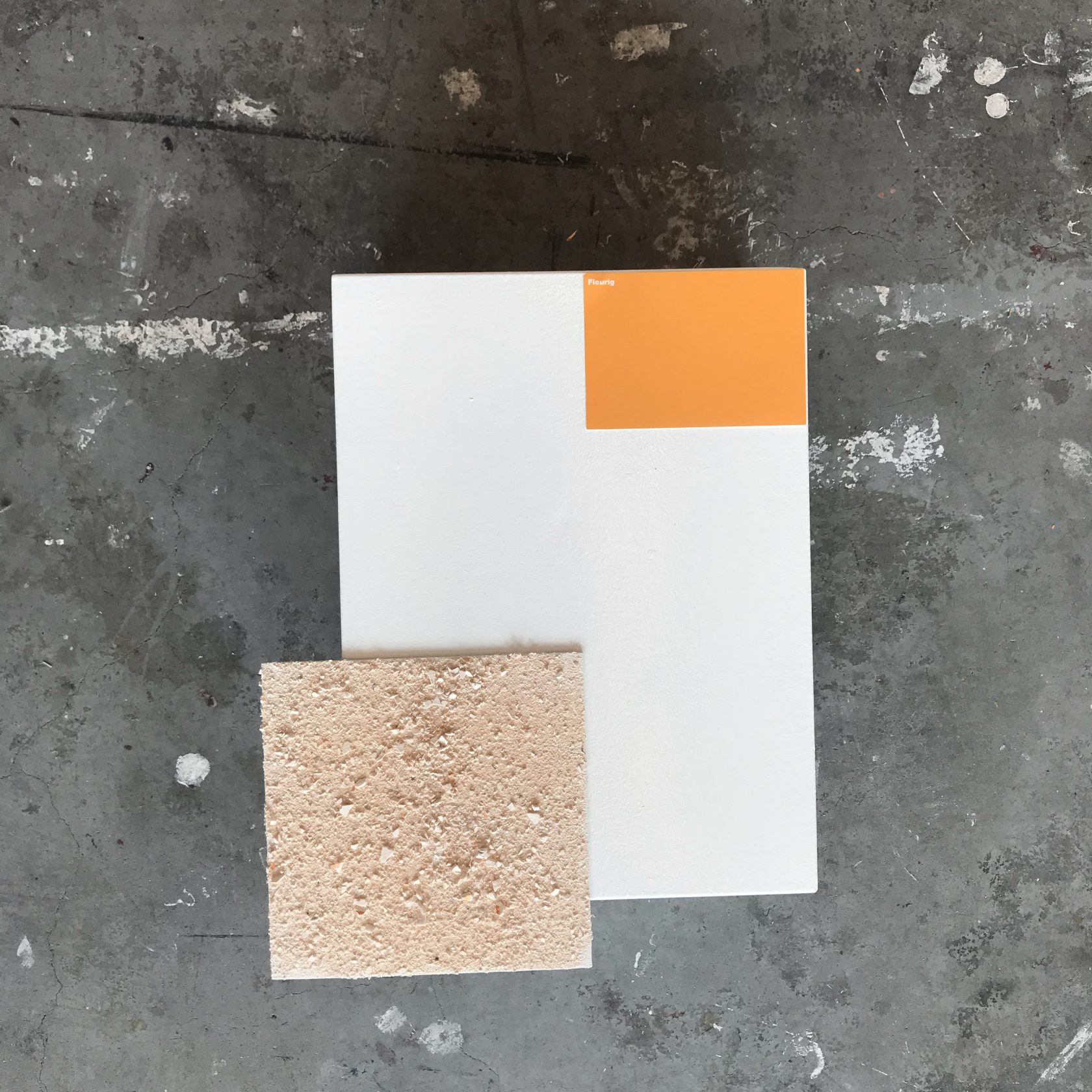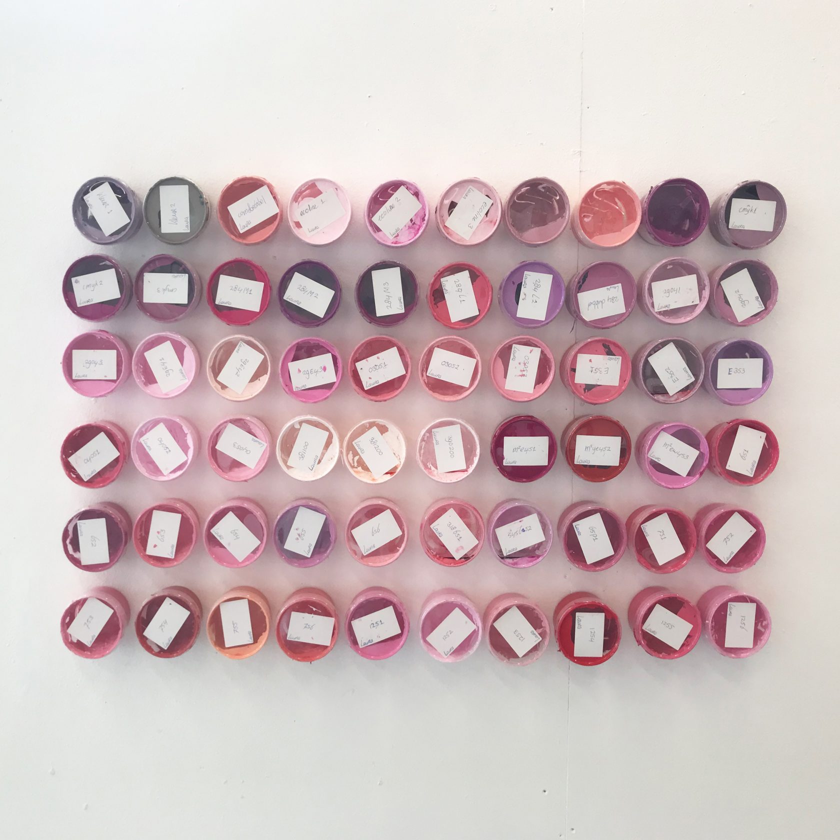 Ook kleuronderzoek lijkt een gedeeld onderwerp. Oranje, roze en verschillende grijzen spelen de hoofdrol in een aantal werken en geven als kleurkaartjes van de GAMMA of plastic potjes gevuld met pigment, het onderzoek weer -helaas zonder duidelijk beeld geworden conclusie- .