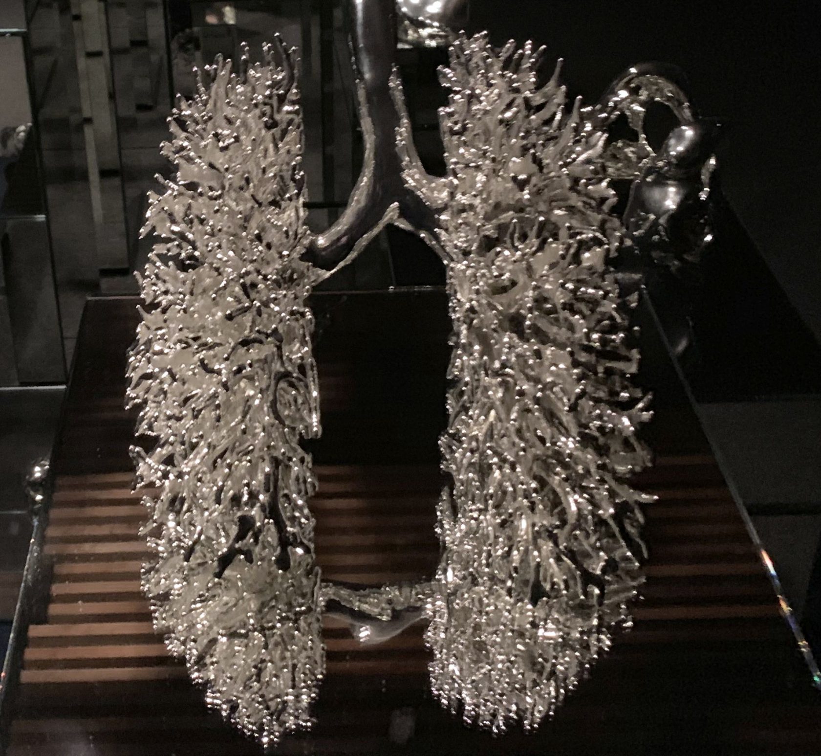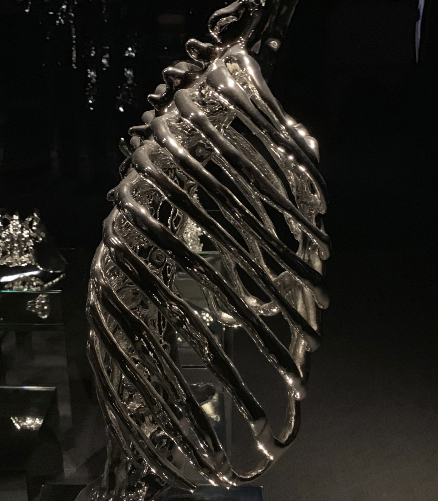 ‘Hier liggen de meeste ‘werken’ geëxposeerd. Het chromen skelet van Gilboa. Hier zijn schedel. Daar zijn alvleesklier. Voet, hand, oren. Chromen longen. Best ironisch. Chroom komt van chromiet en da’s gedolven door mijnwerkers die vaak longklachten krijgen.’