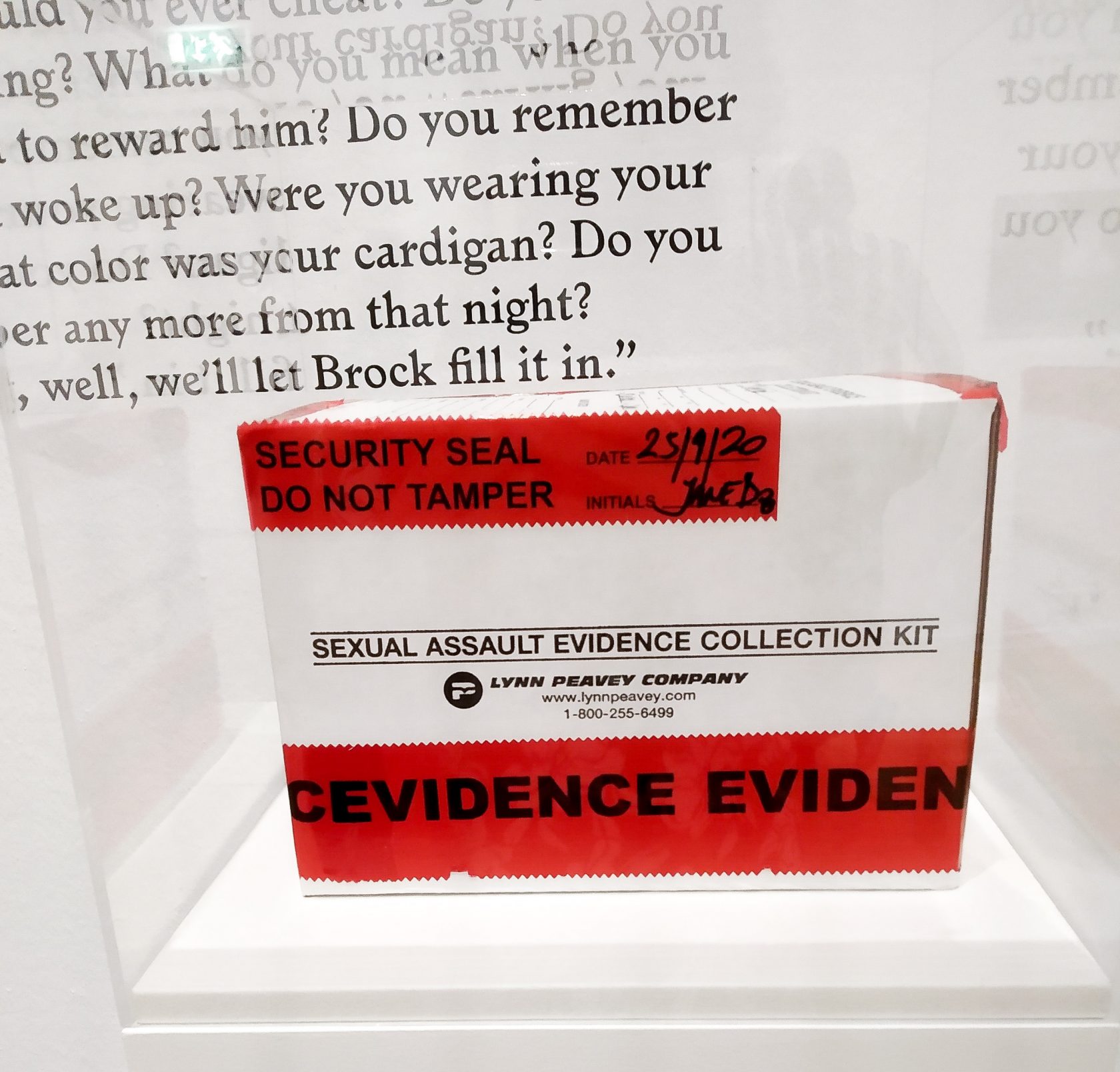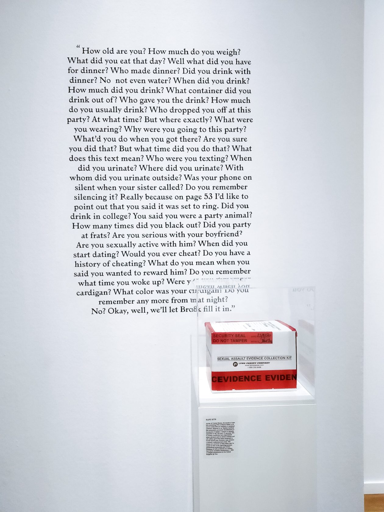 Dat dit dikwijls het geval is, is te zien bij het werk dat in de tweede ruimte staat. Op de muur staan een veelvoud aan vragen die slachtoffers op zich afgevuurd krijgen. “What did you drink?” “How much?” “Are you a party animal?” “Are you serious with your boyfriend?” “Would you ever cheat?”. Voor deze muur staat een kartonnen doos in een vitrinekast met in het rood EVIDENCE erop. Het is een ‘sexual assault evidence collection kit’ die worden gebruikt in Amerika. Deze boxen met DNA bewijs worden veelal niet naar de juiste laboratoria gestuurd en onderzocht. Dit zorgt ervoor dat veel daders niet worden geïdentificeerd. In de tekst bij de box wordt de grootte van het probleem in cijfers uitgedrukt.